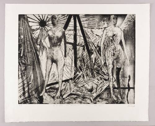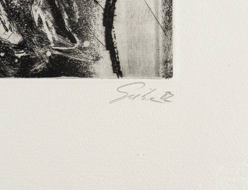 Rechts unten in Bleistift signiert und datiert: ″Giebe 82″. Links Auflagenbezeichnung: E.A.″ Mittig Titel: ″zu G. Grass 'Die Blechtrommel' - Danzig. Das Ende″. Blindstempel des Druckers Heinz Sparwart, Dresden. Wasserzeichen der Hahnemühle. – Sehr guter Zustand.