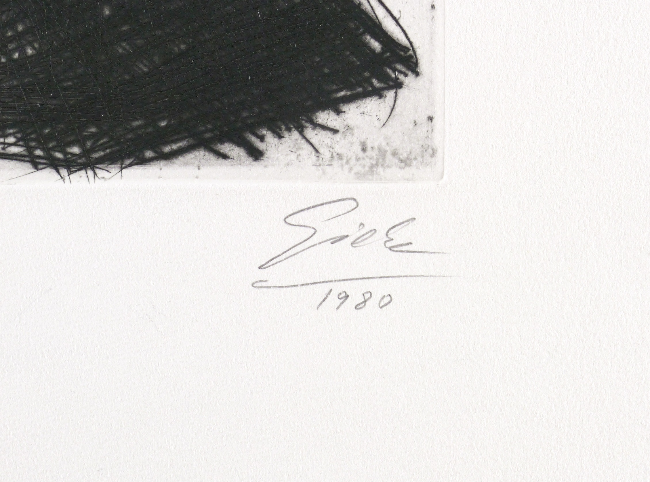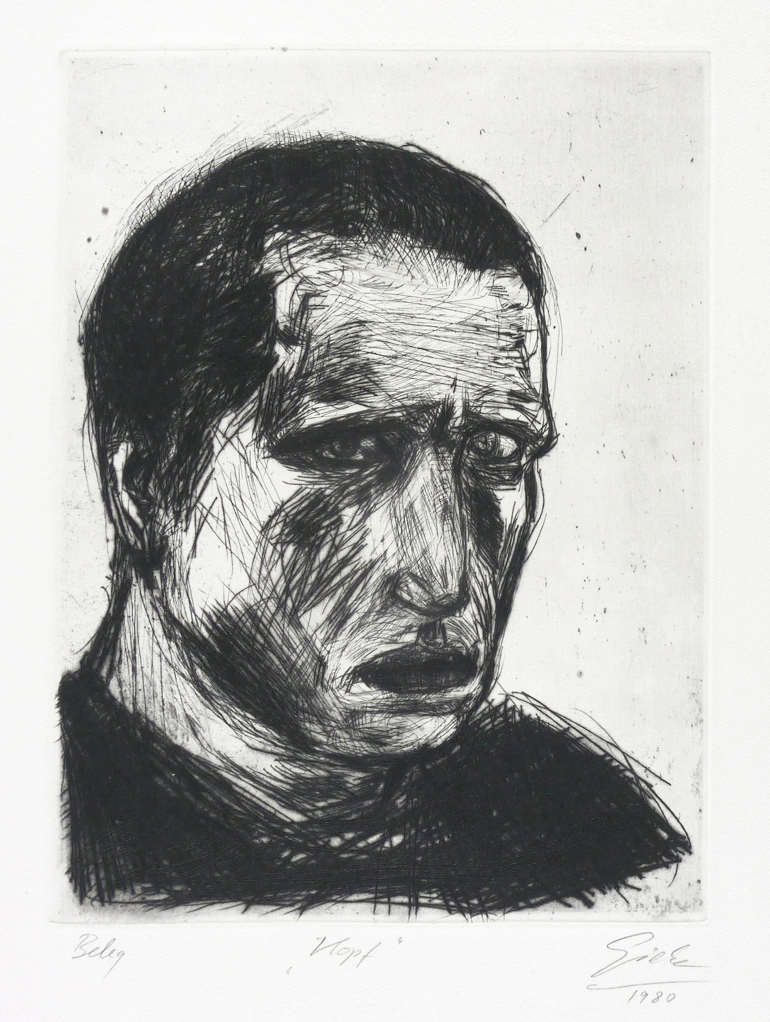 Rechts unten in Bleistift signiert und datiert: ″Giebe 80″. Links Auflagenbezeichnung: ″Beleg″. Mittig bezeichnet: ″Kopf″. – Belegexemplar des Dresdner Tiefdruckers Heinz Sparwart. – Sehr guter Zustand.