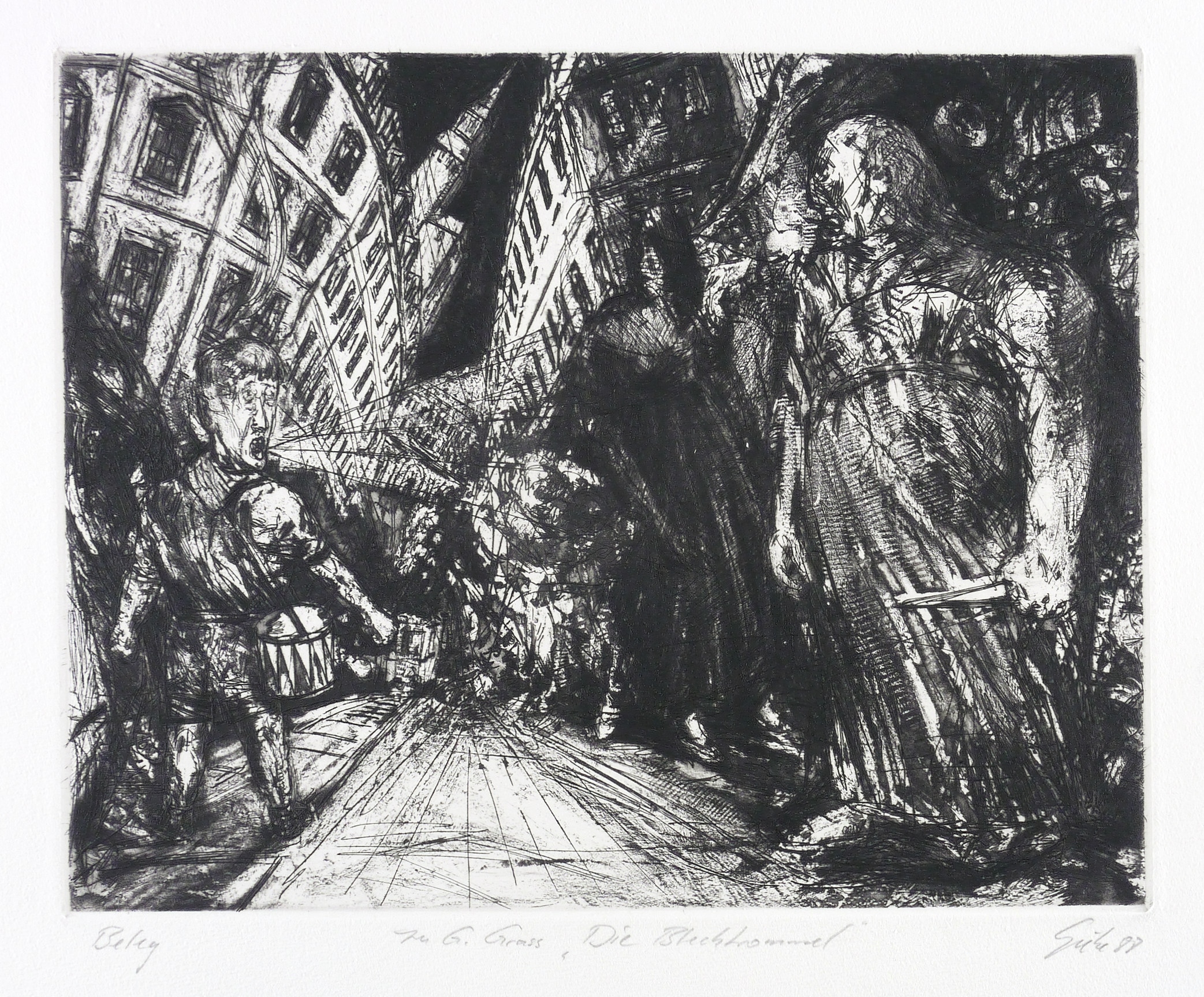Rechts unten in Bleistift signiert und datiert: ″Giebe 88″. Links Auflagenbezeichnung: ″Beleg″. Mittig Titel:″zu G. Grass 'Die Blechtrommel'″. – Makellos. Sehr guter Zustand.