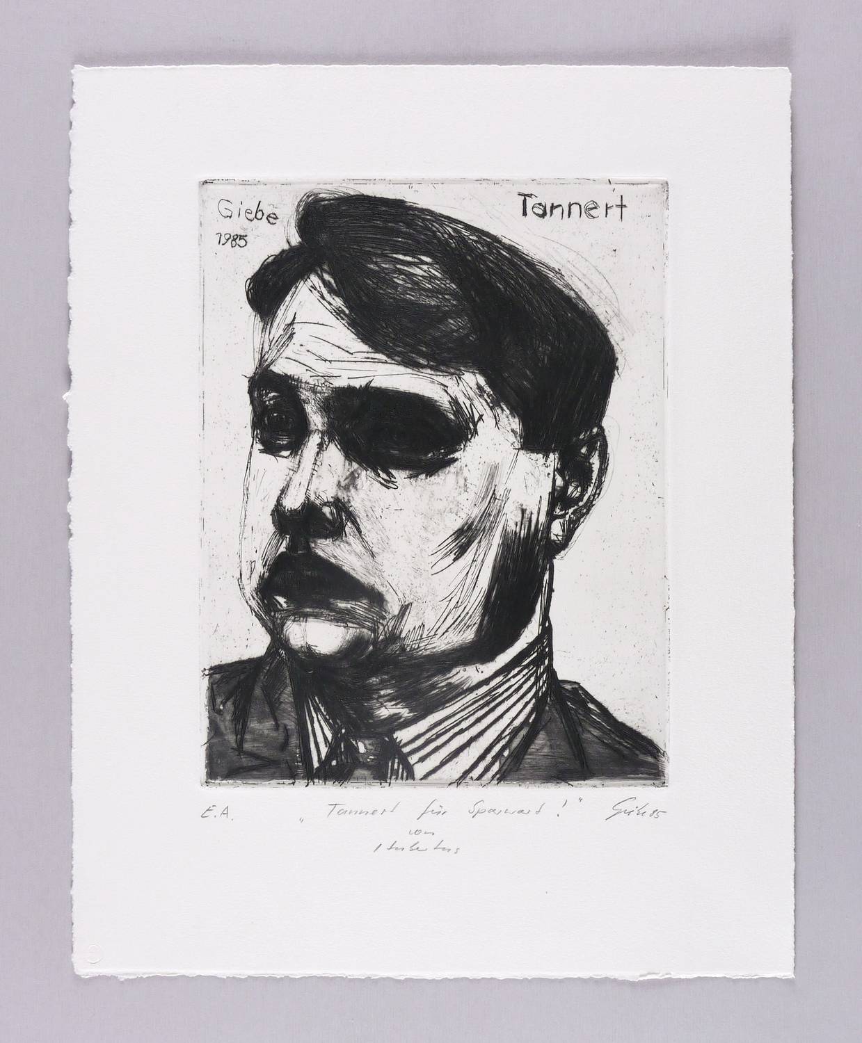 Rechts unten in Bleistift signiert und datiert: ″Giebe 85″. Links Auflagenbezeichnung: ″E.A.″ Mittig bezeichnet: ″Tannert für Sparwart!″ In der Platte in den oberen Ecken Inschrift: ″Giebe 1985 // Tannert″. Blindstempel des Druckers Heinz Sparwart, Dresden. – Provenienz: Sammlung Heinz Sparwart, Dresden. – Sehr guter Zustand.