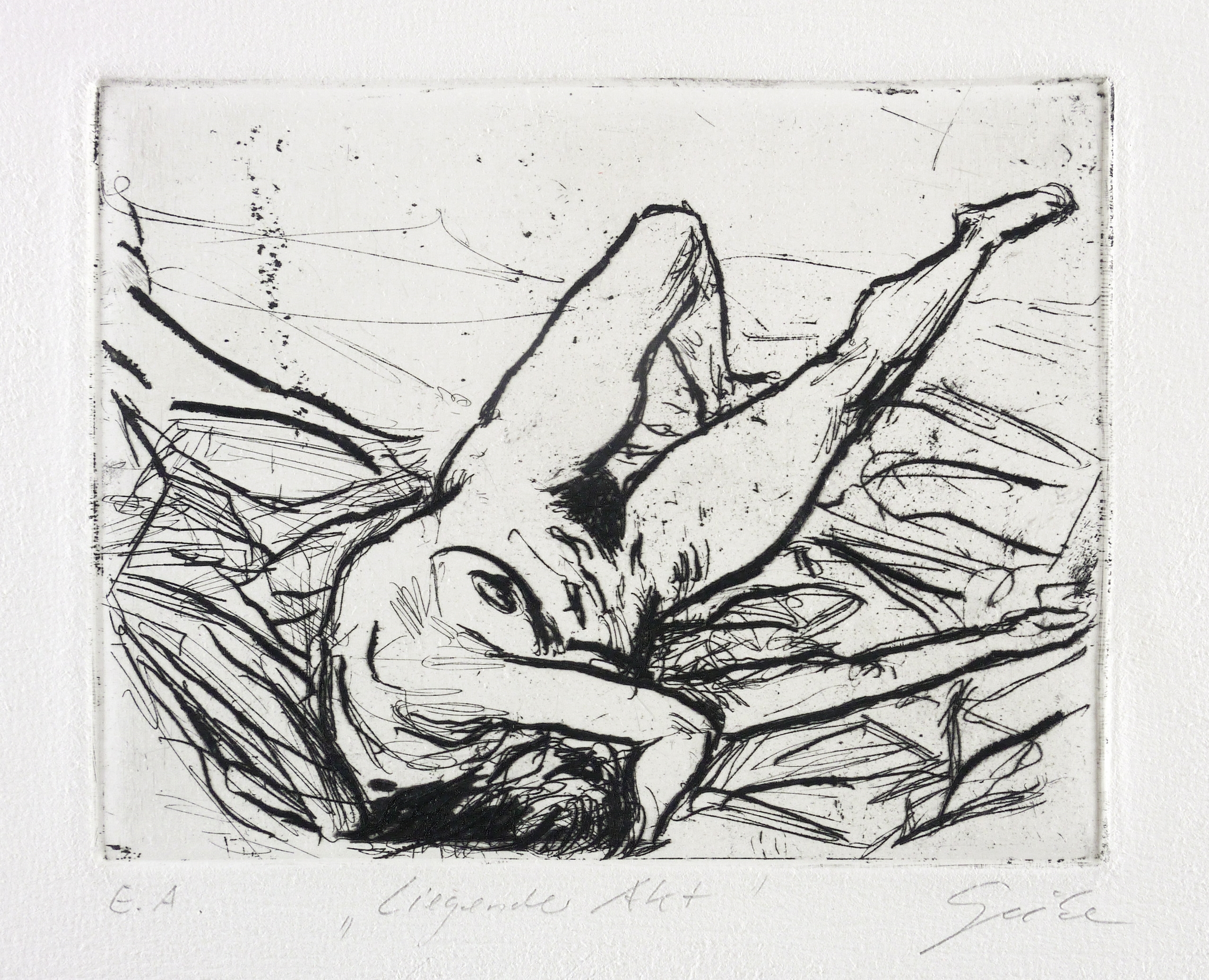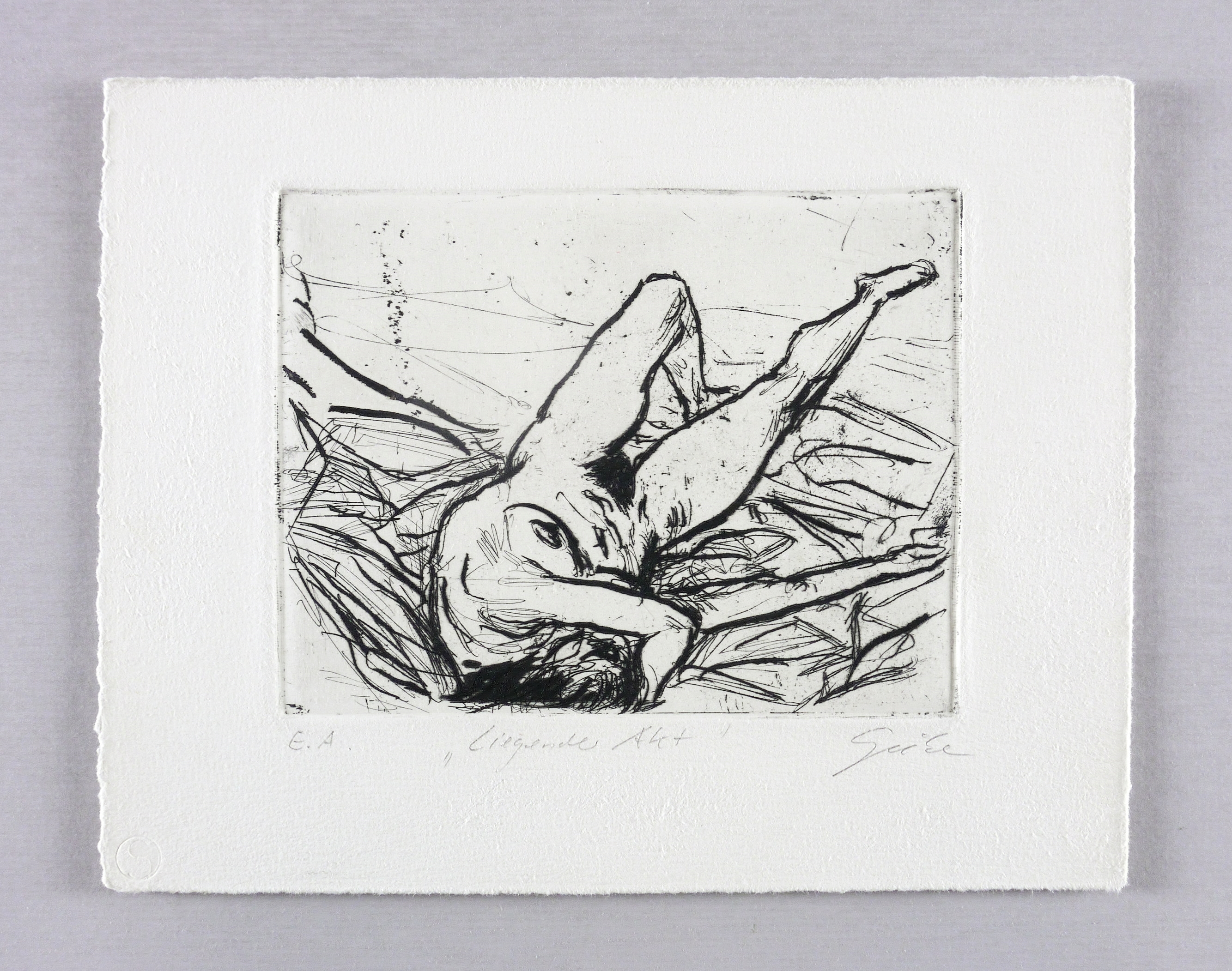Rechts unten in Bleistift signiert: ″Giebe″. Links Auflagenbezeichnung: ″E.A.″ Mittig Titel: ″Liegender Akt″. Trockenstempel des Druckers Heinz Sparwart, Dresden. – Sehr guter Zustand.
