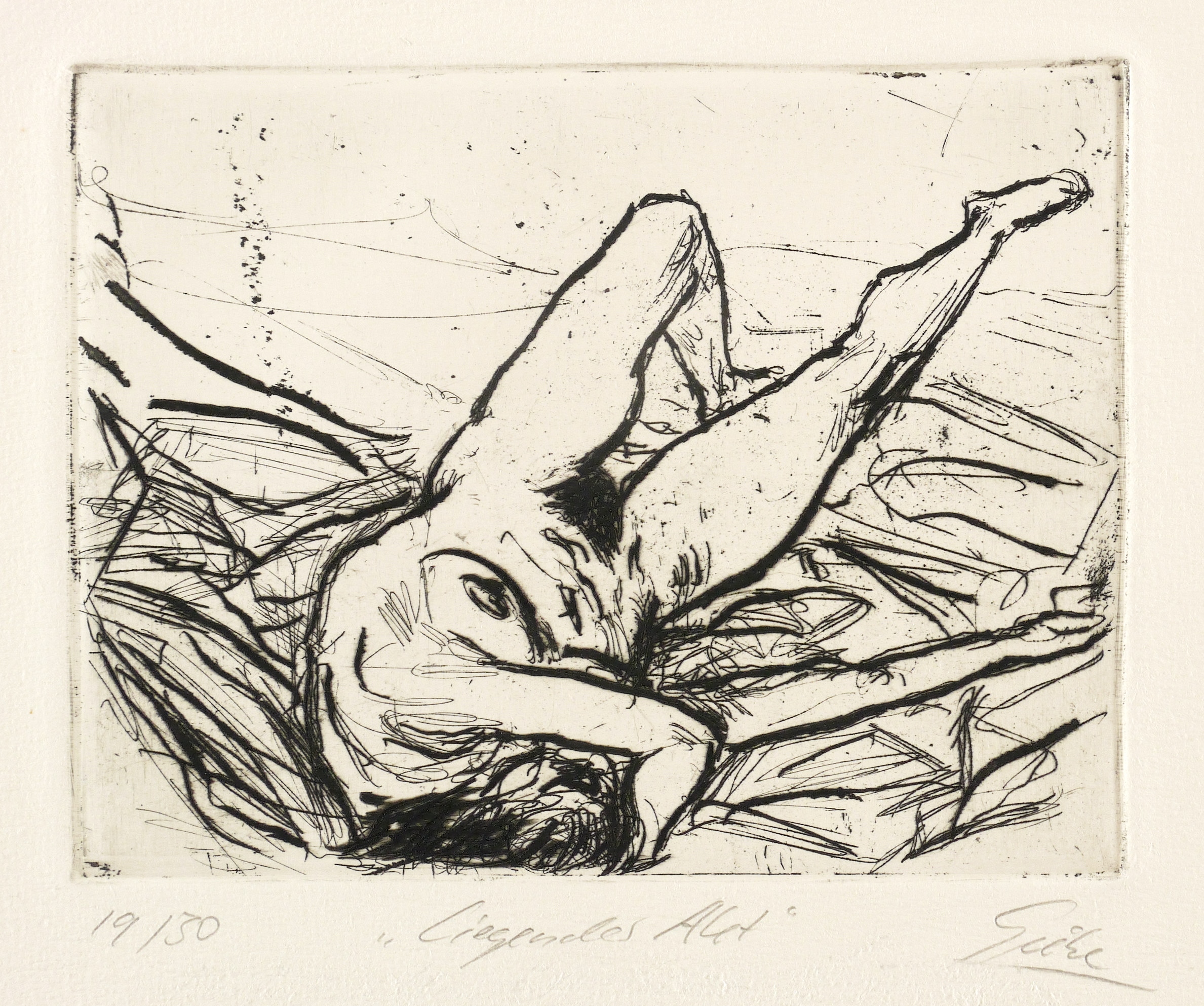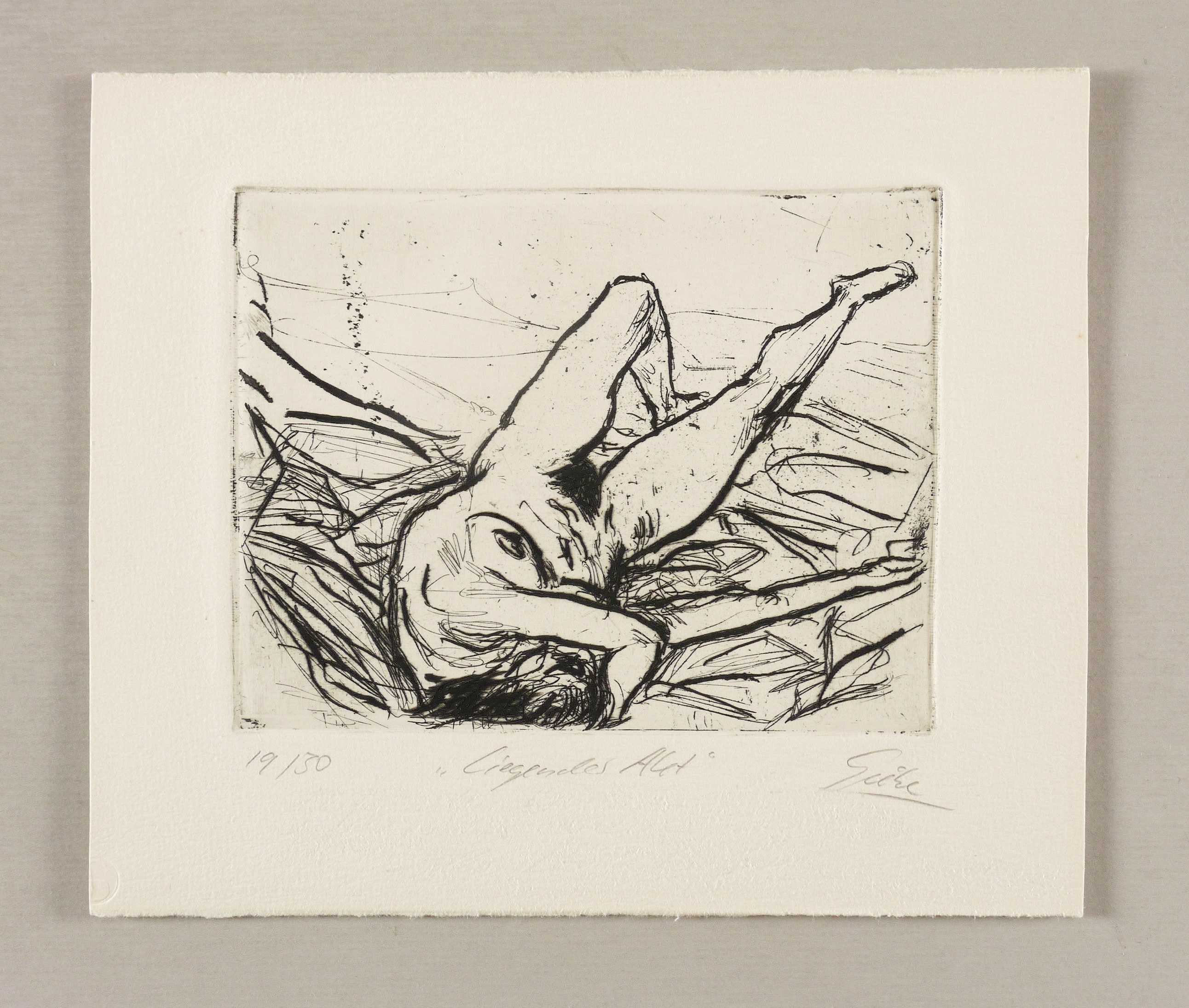 Rechts unten in Bleistift signiert: ″Giebe″. Links Auflagenbezeichnung: ″19/20″. Mittig Titel: ″Liegender Akt″. Trockenstempel des Druckers Heinz Sparwart, Dresden. – Sehr guter Zustand.