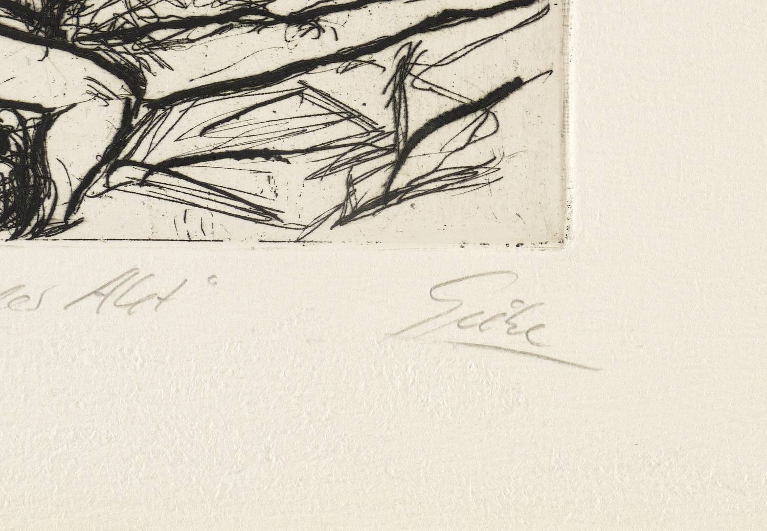1980-1990. Radierung / Strichätzung, in Schwarz, auf hellchamois Hahnemühle. – Originale Künstlergrafik, von Hubertus Giebe. – Auflage Exemplar Nr. 19/20. – 12,3 x 16,0 cm (Darstellung / Platte), 19 x 23 cm (Blatt).
