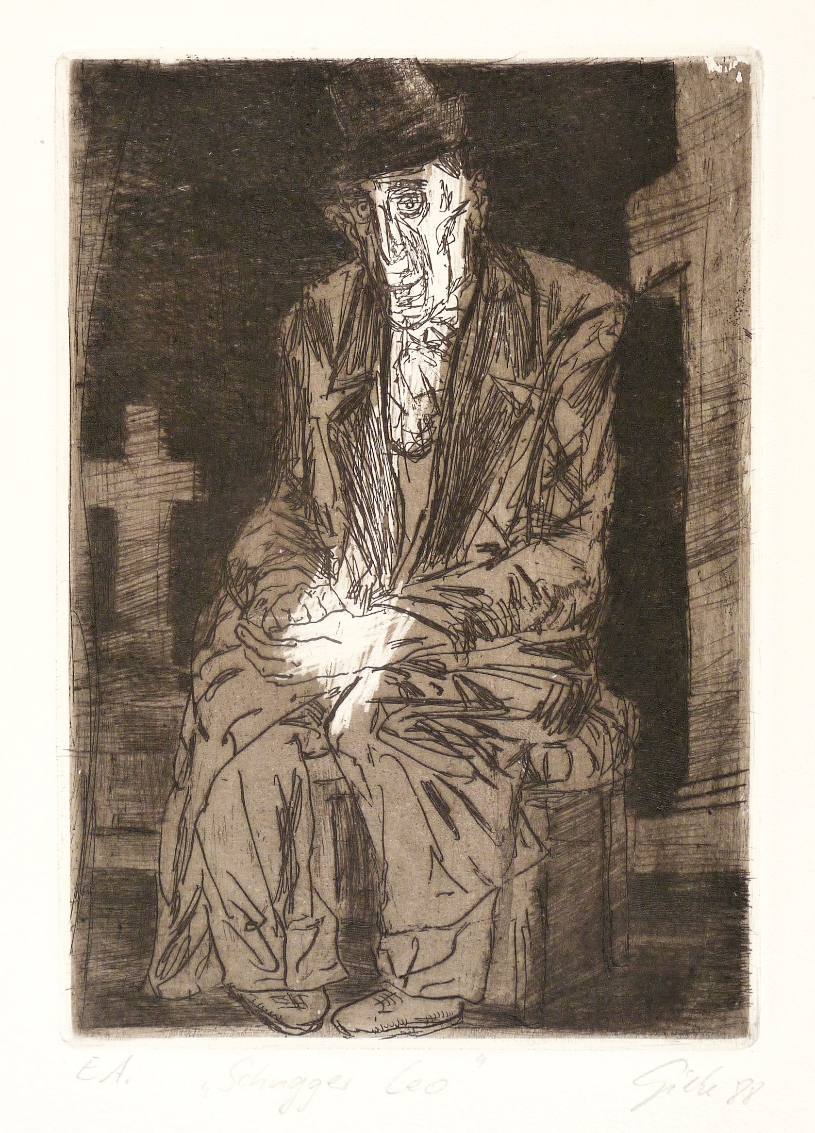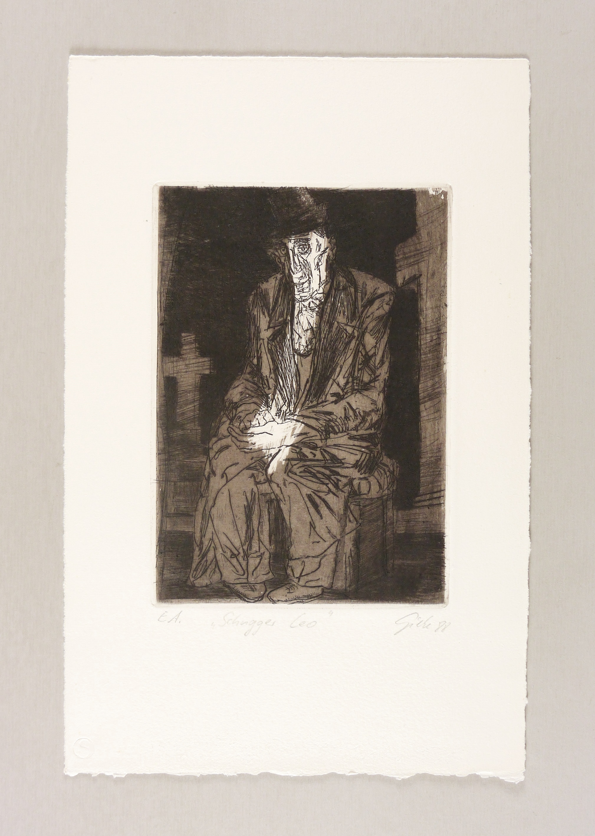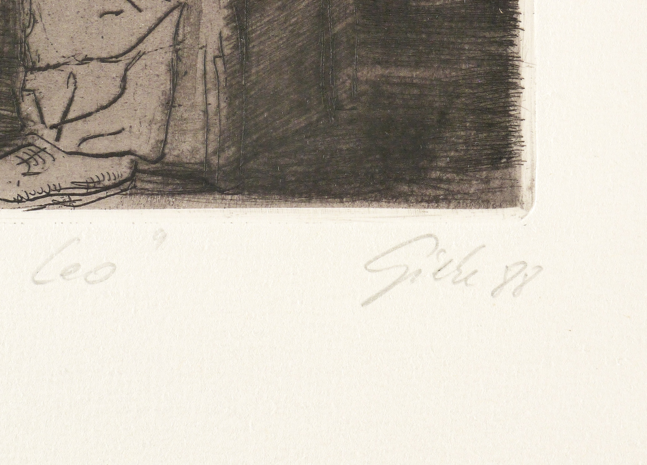 Rechts unten in Bleistift signiert und datiert: ″Giebe 88″. Links Auflagenbezeichnung: E.A.″ Mittig Titel: ″Schugger Leo″. Blindstempel des Druckers Heinz Sparwart, Dresden. – Sehr guter Zustand.