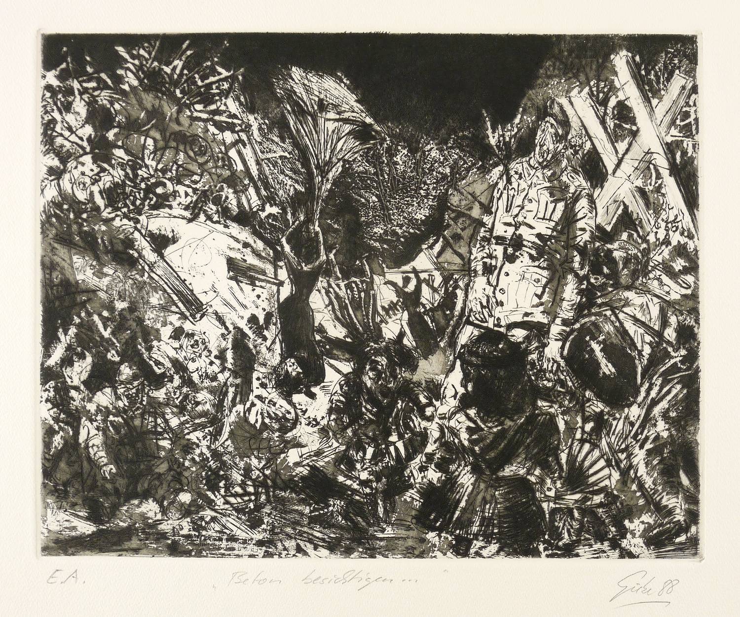 Rechts unten in Bleistift signiert und datiert: ″Giebe 88″. Links Auflagenbezeichnung: ″E.A.″ Mittig Titel: ″Beton besichtigen″. – Ohne Mängel. Sehr guter Zustand.
