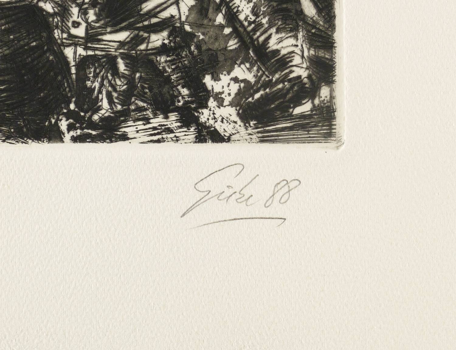 1988. Radierung / Strichätzung, Reservage, Aquatinta & Kaltnadel, in Schwarz, auf kräftigem hellchamois Velin. – Originale Künstlergrafik, von Hubertus Giebe. – Künstlerexemplar (e.a.). – 25,5 x 32,5 cm (Darstellung / Platte), 39 x 54 cm (Blatt).