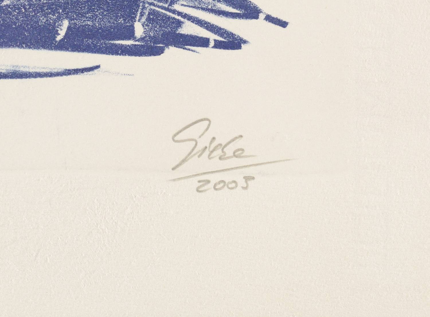 2003. Lithografie / Kreidelithografie, in Graublau, auf hellchamois Hahnemühle. – Originale Künstlergrafik, von Hubertus Giebe. – Auflage Exemplar Nr. 19/30. – 42,3 x 32,7 cm (Darstellung / Druckbild), 54 x 40 cm (Blatt).