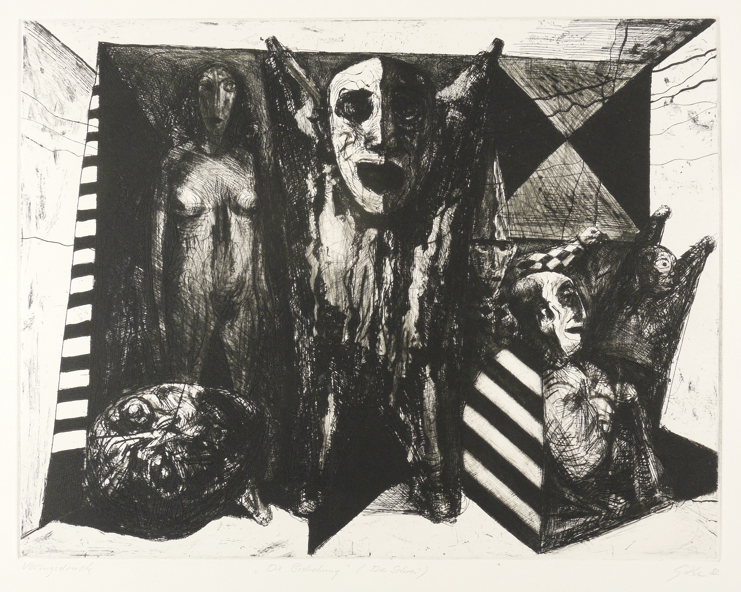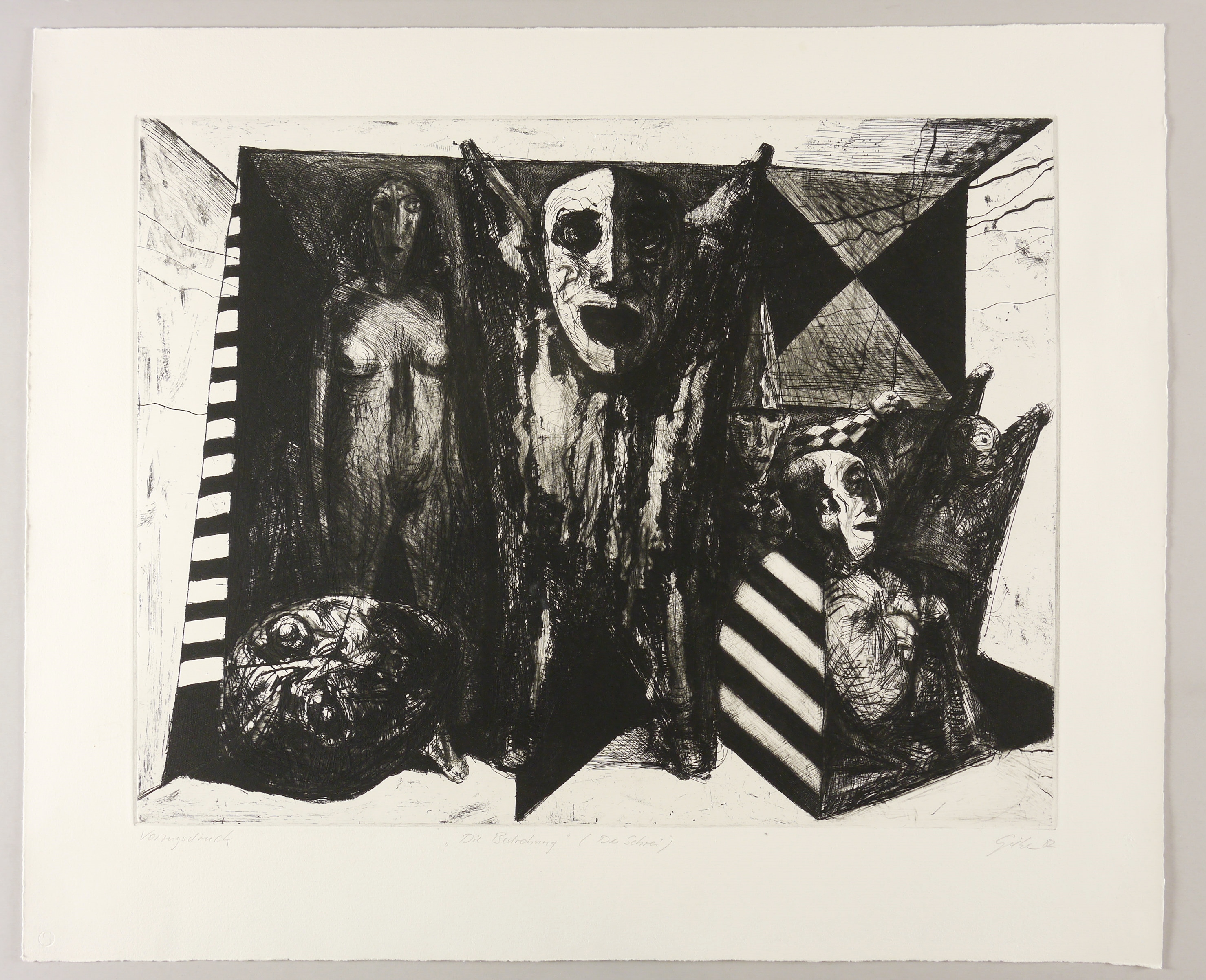 Rechts unten in Bleistift signiert und datiert: ″Giebe 82″. Links Auflagenbezeichnung: ″Vorzugsdruck″. Mittig Titel: ″Die Bedrohung (Der Schrei)″. Blindstempel des Druckers Heinz Sparwart, Dresden. Wasserzeichen der Hahnemühle. – Guter Zustand.