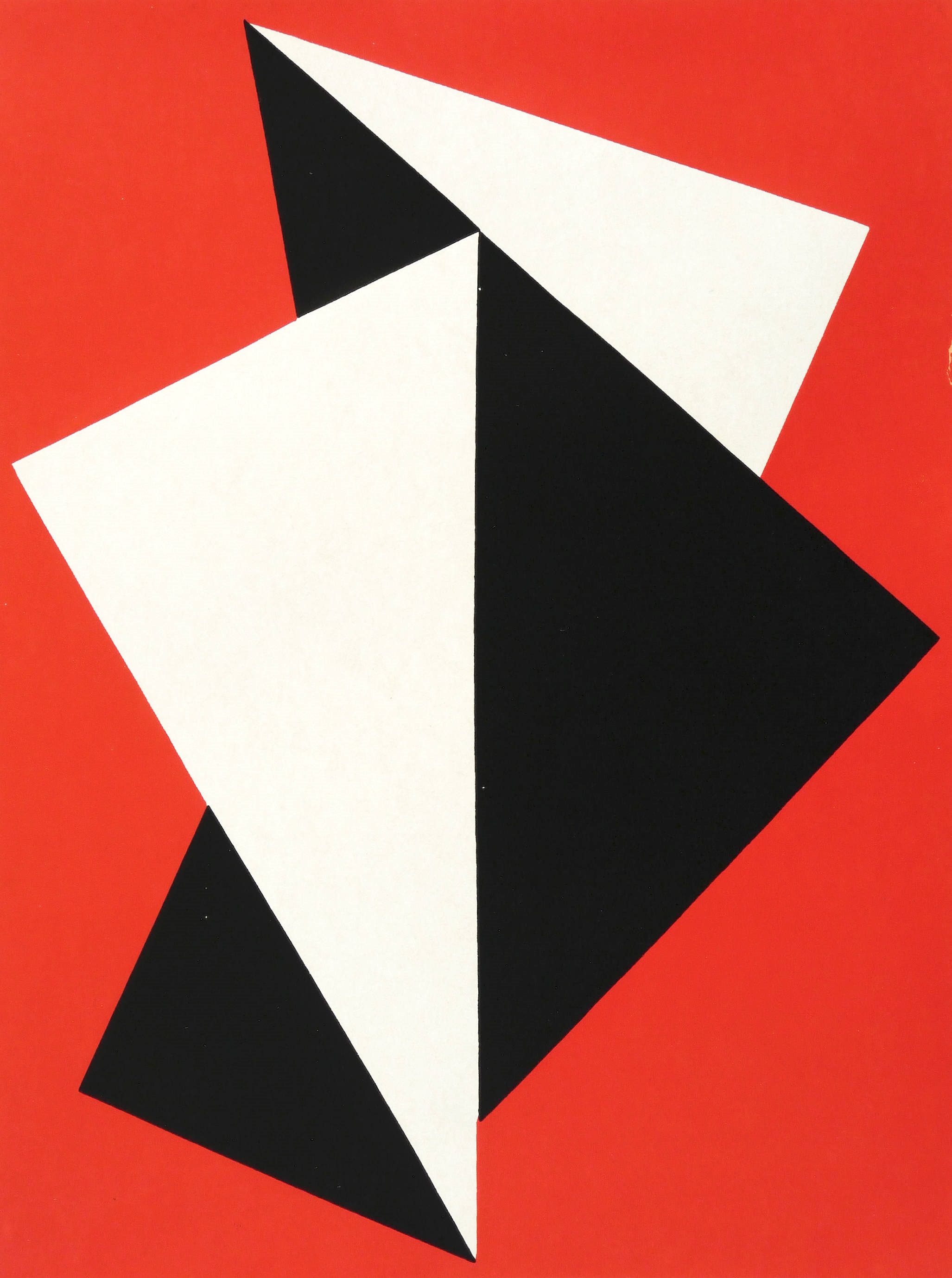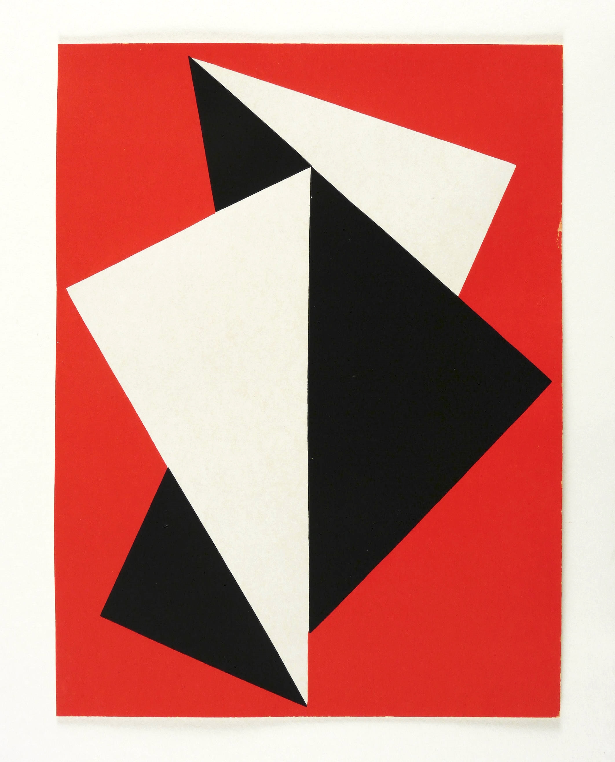 Aus: Hermann Glöckner, Werke aus den Jahren 1945 bis 1975 (Dresden: Büro für Kunstausstellungen des Bezirks Dresden 1976). – Nicht handsigniert. Verso von fremder Hand in Bleistift bezeichnet: ″H. Glöckner - Faltung - '76″. – Originalgrafisches Blatt für den Katalog zur Ausstellung im Pretiosensaal des Dresdner Schlosses und im Glockenspielpavillon des Zwingers. - Die Gestaltung dieses Siebdrucks geht auf eine Komposition aus dem Jahr 1971 zurück (Freundschaftstafel). – Blattkante rechts minimal bestoßen. Guter Zustand.