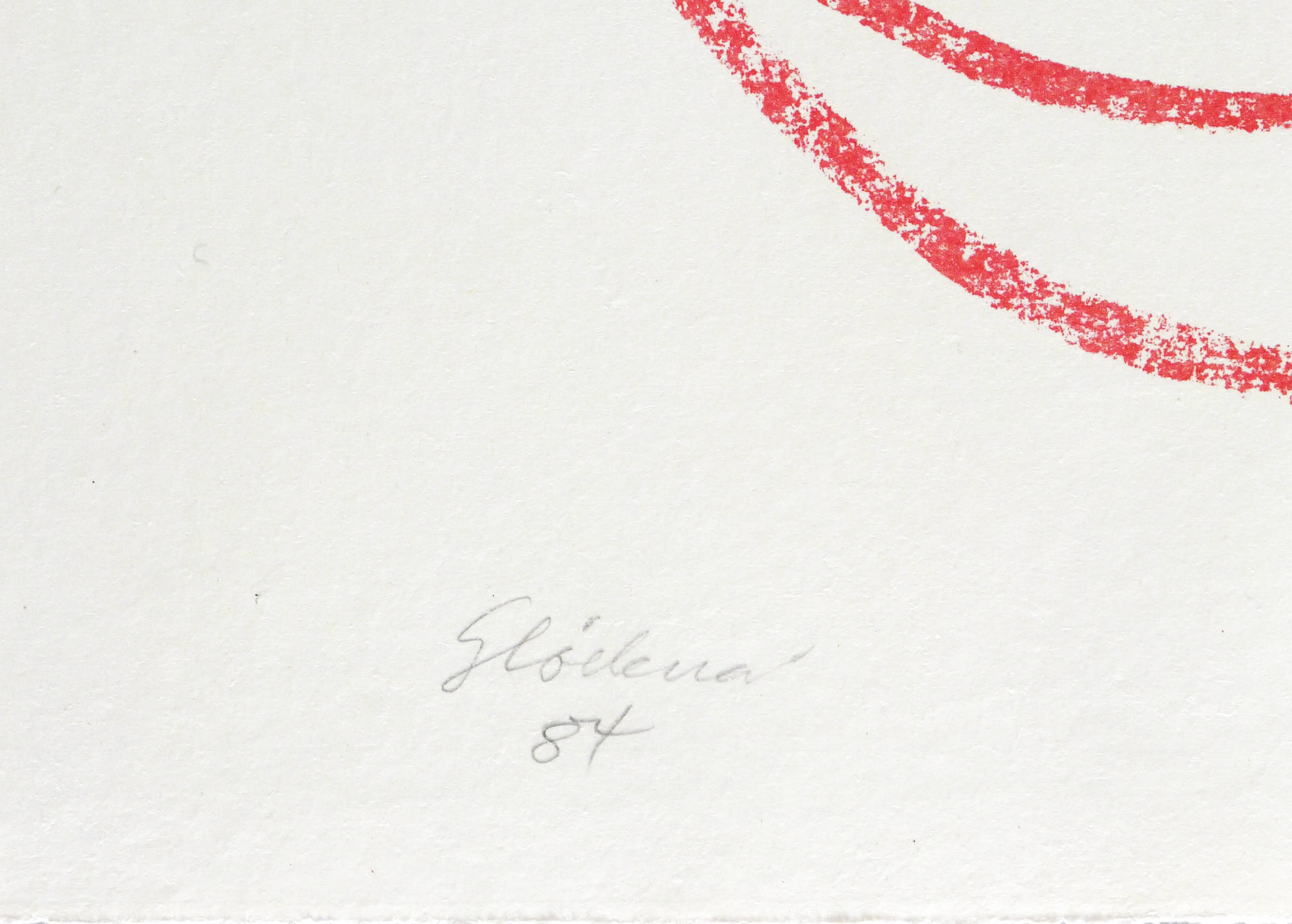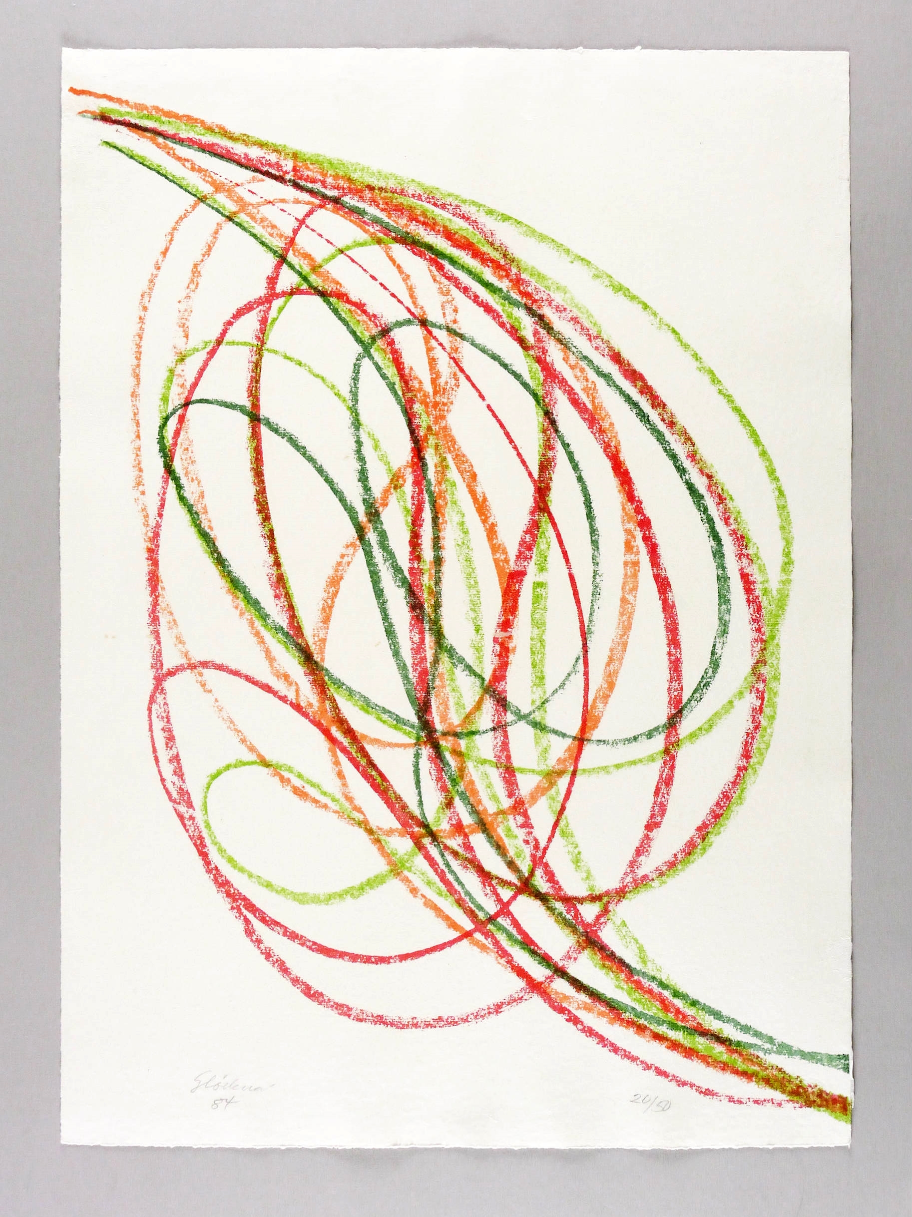 Links unten in Bleistift signiert und datiert: ″Glöckner 84″. Rechts Auflagenbezeichnung: ″20/50″. Wasserzeichen der Hahnemühle. – Einzige Lithografie des Künstlers. Basierend auf einer mehrfarbigen Handzeichnung aus der Werkgruppe der ″Schwünge″. 1984 unter Aufsicht des Künstlers in der städtischen Druckwerkstatt in Dresden-Friedrichstadt vom Steindrucker Michael Wackwitz aufwändig von 4 Steinen gedruckt. – Kaum merkliche geglättete Druckspuren im Papierrand. Insgesamt guter Zustand.