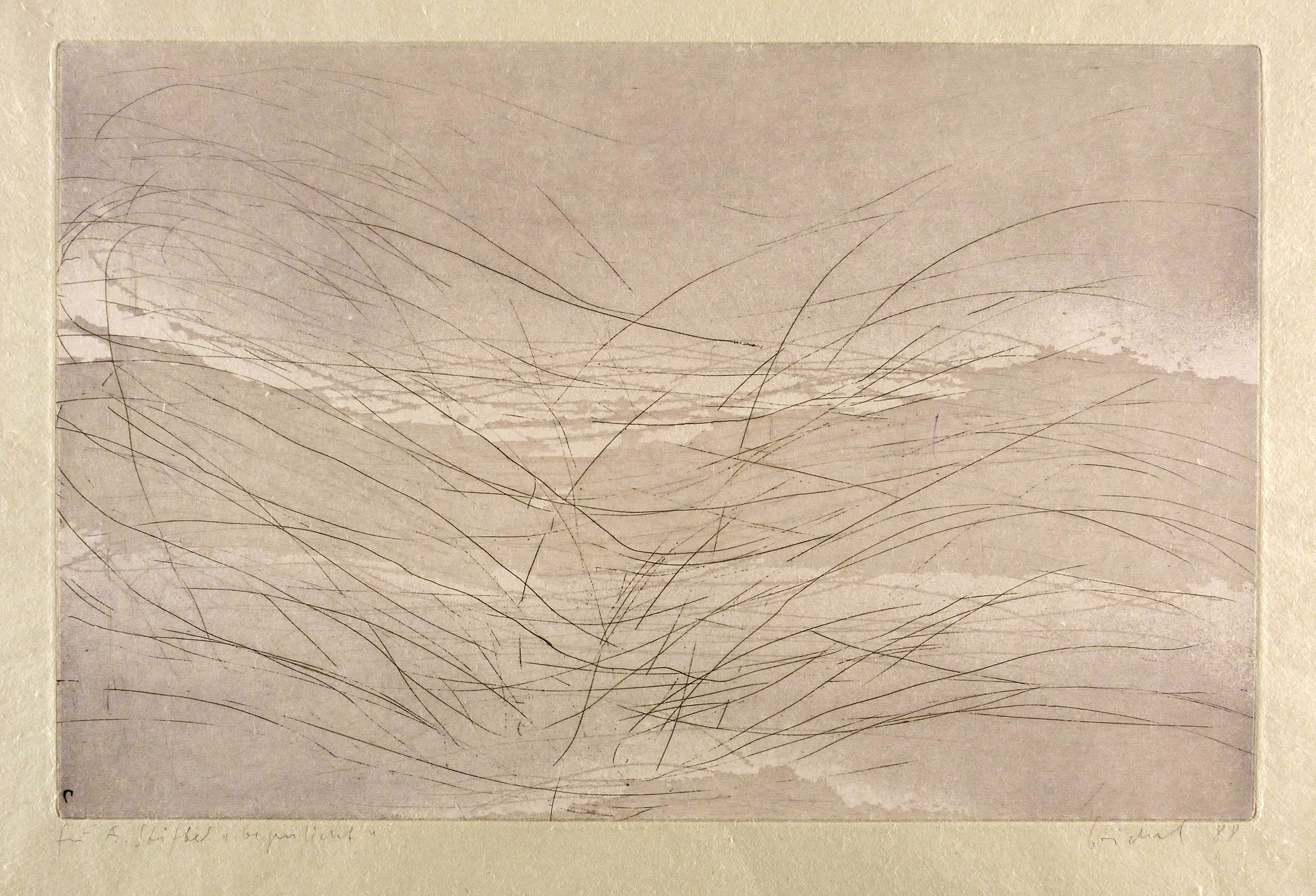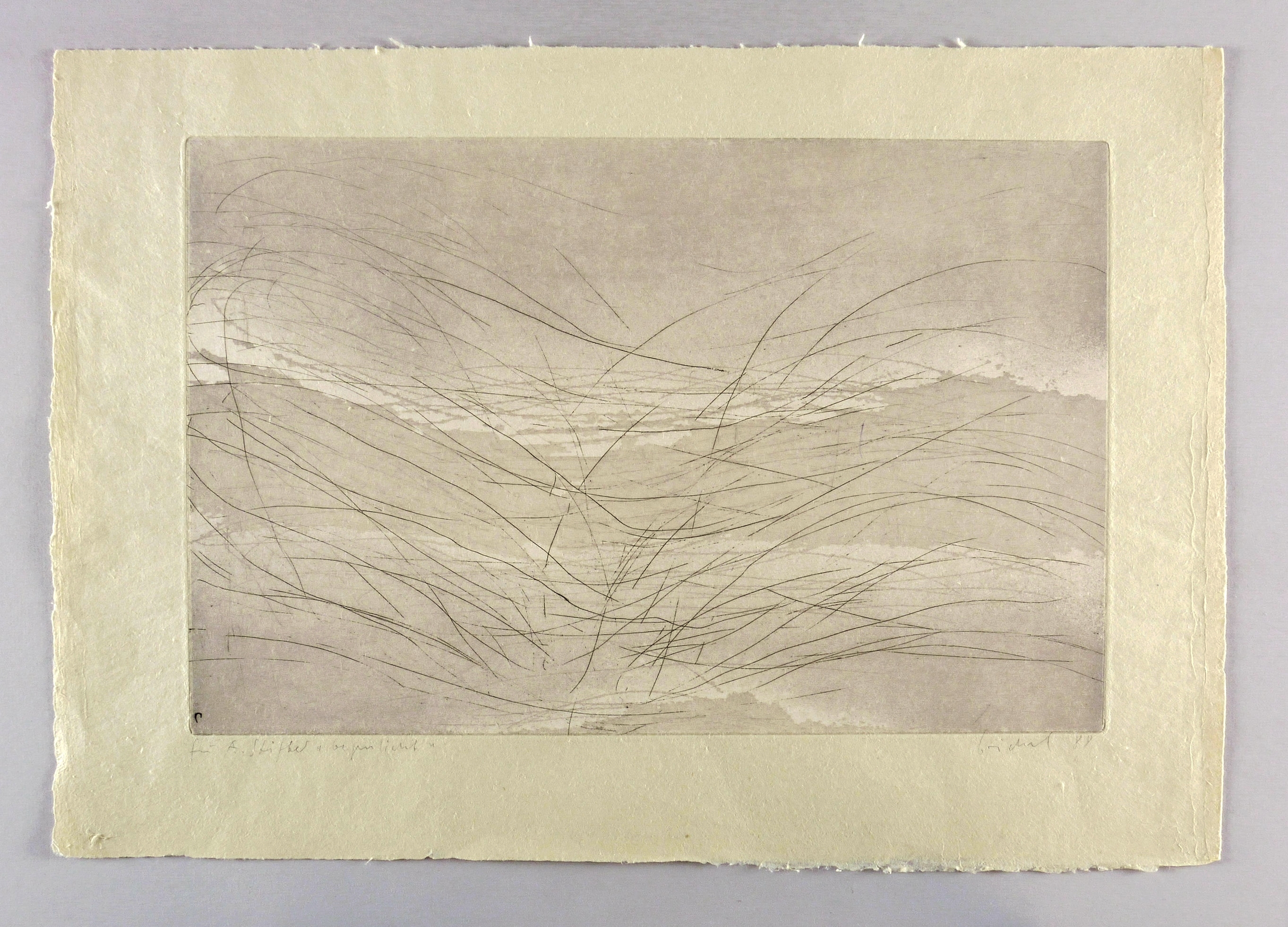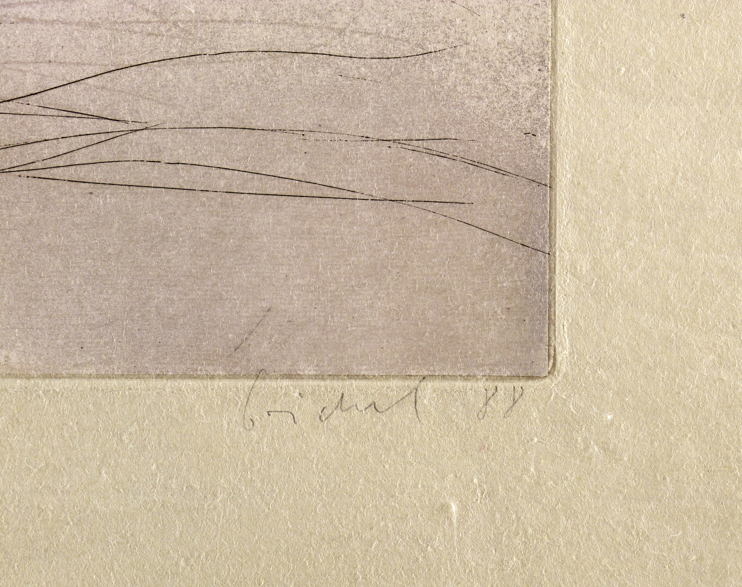 1988. Farbradierung / Aquatinta & Reservage, in Grauviolett & Schwarz, auf rauem chamois Bütten. – Originale Künstlergrafik, von Eberhard Göschel. – Künstlerexemplar (e.a.). – 32,2 x 49,7 cm (Darstellung / Platte), 44 x 64 cm (Blatt).