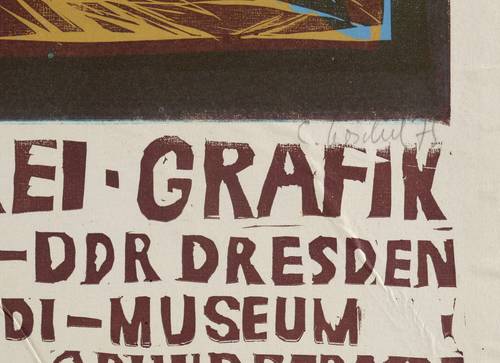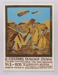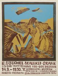 Rechts unten in Bleistift signiert und datiert: ″E. Göschel 75″. – Originalgrafisches Künstlerplakat zur Ausstellung ″Eberhard Göschel. Malerei, Grafik″ im Leonhardimuseum in Dresden 14.9.-19.10.1975. – Provenienz: Sammlung Gerlint und Gert Söder, Dresden. – Alt auf Trägerkarton aufgezogen. Guter Zustand.