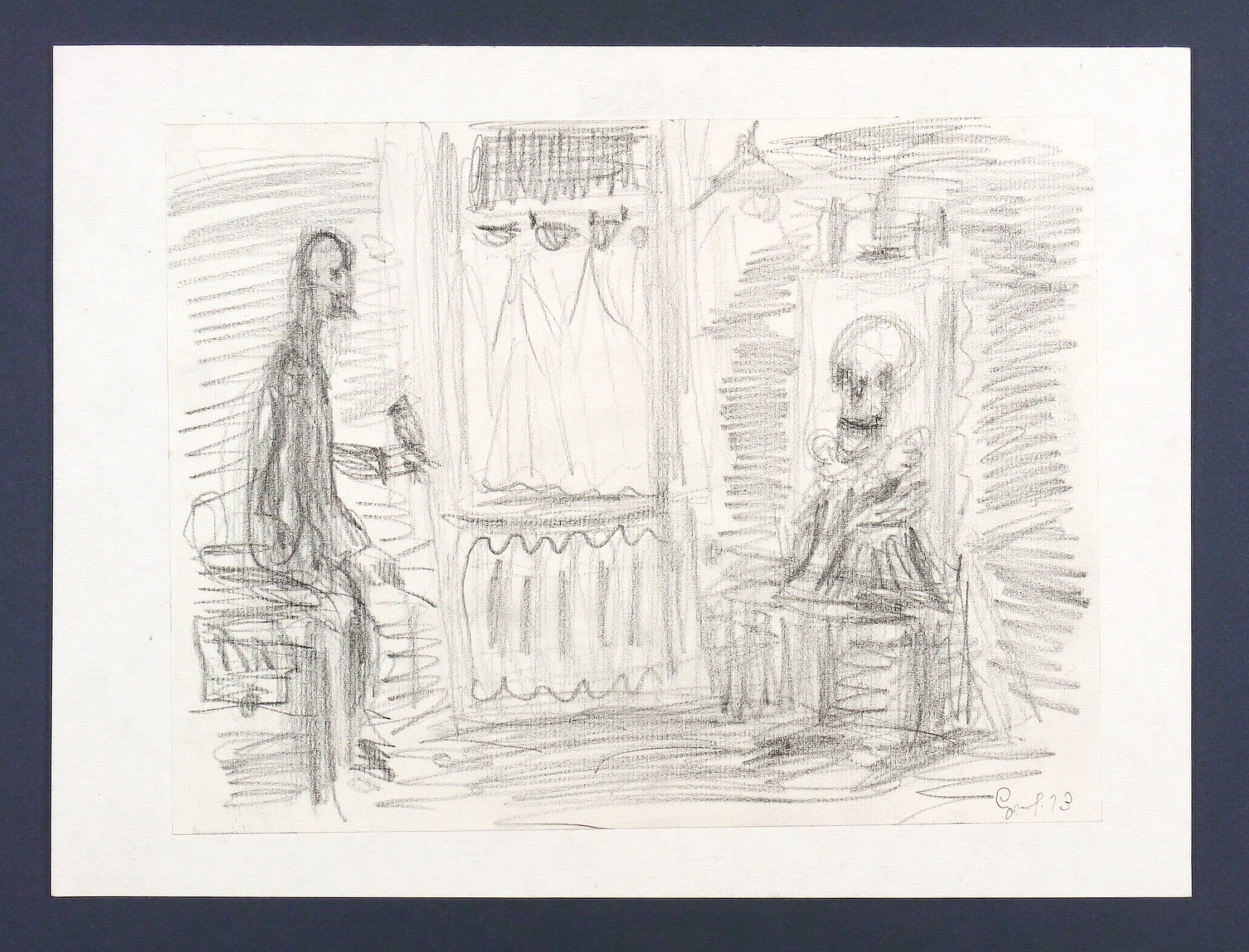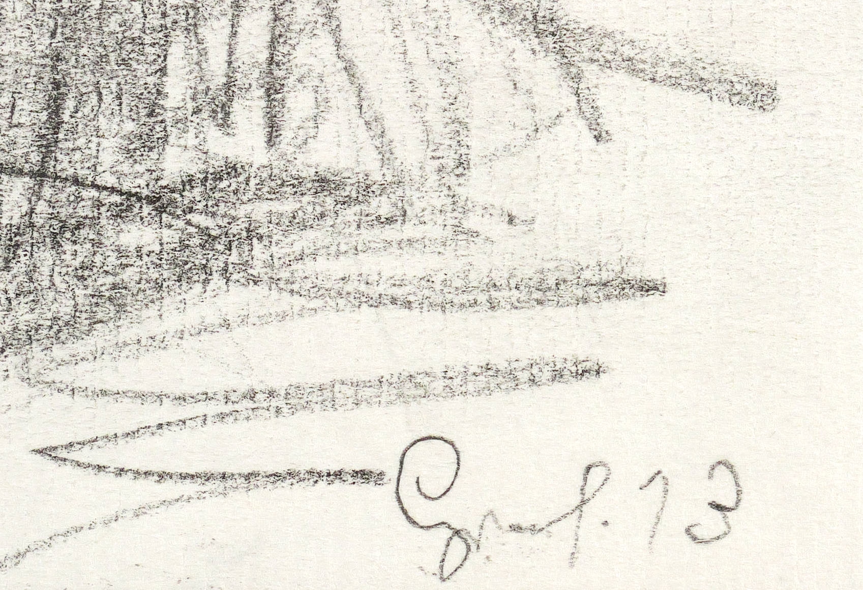 2013. Zeichnung / Graphitzeichnung, partiell gewischt, auf Maschinenbütten. – Originale Künstlergrafik, von Peter Graf. – Unikat. – 21,2 x 27,5 cm (Darstellung / Blatt), 25 x 34 cm (Trägerkarton).