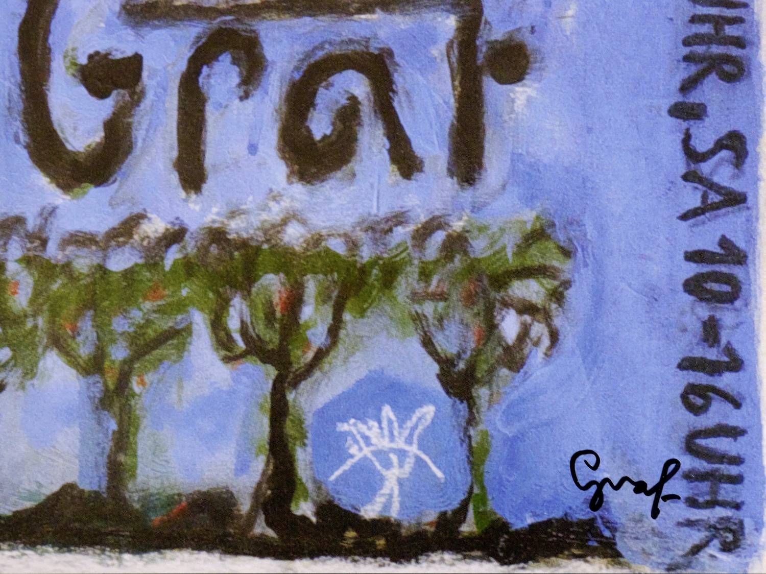 Rechts unten in schwarzem Faserstift signiert: ″Graf″. – Plakat zur Ausstellung ″Peter Graf - Heilbutt, kalt geräuchert″ in der Galerie Himmel in Dresden, 23. April - 11. Juni 2016. – Tadelloser Zustand.