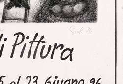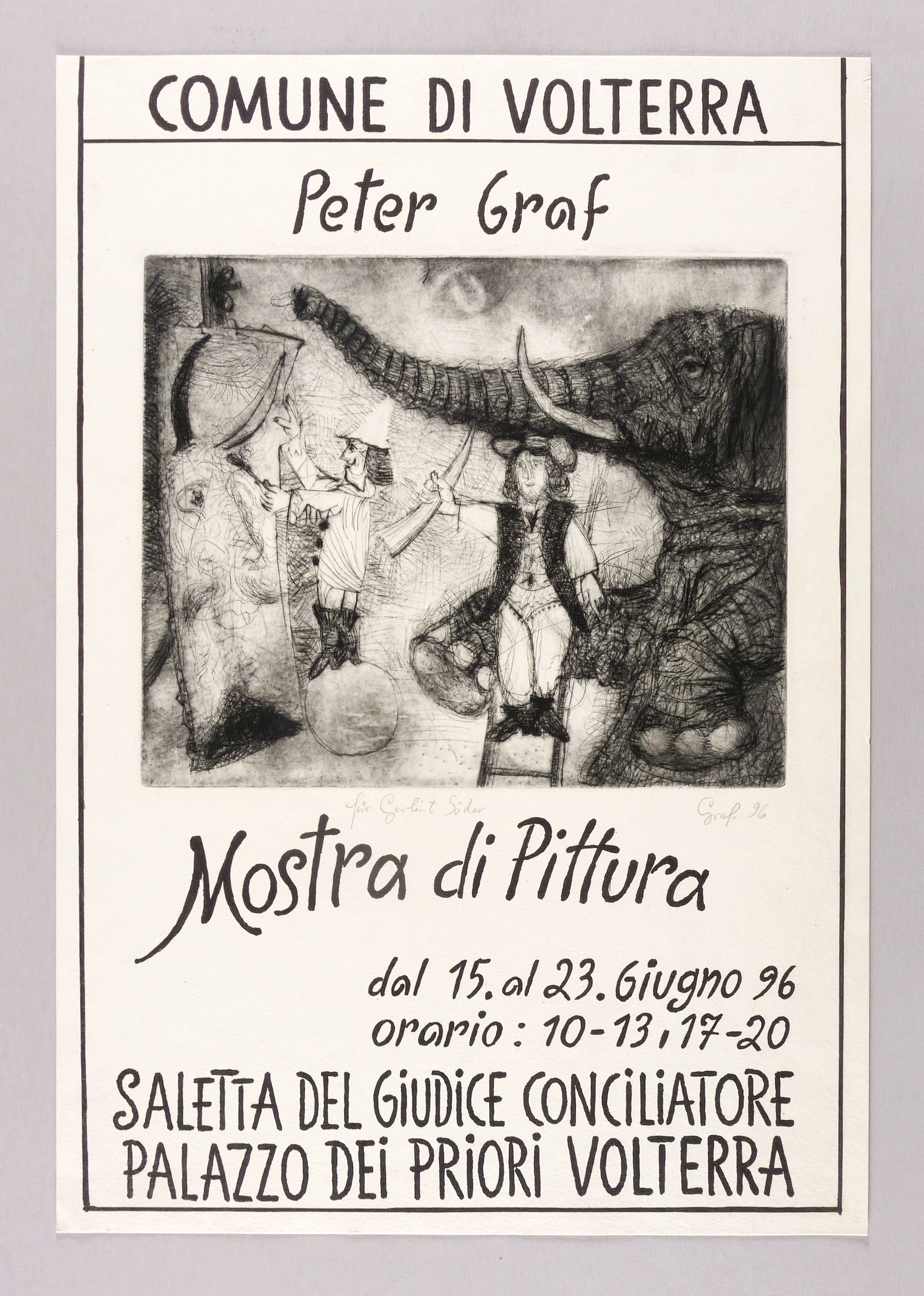 Rechts unter der Darstelung in Bleistift signiert und datiert: ″Graf 96″. Mittig Widmung. – Originales Künstlerplakat zur Ausstellung ″Peter Graf. Mostra di Pittura″ 1996 in der Saletta del Giudice Cociliatore im Palazzo dei Priori in Volterra. – Provenienz: Sammlung Gerlint Söder und Erhard Frommhold, Dresden. – Tadellos. Sehr guter Zustand.