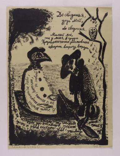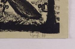 Rechts unten in Kugelschreiber signiert und datiert: ″Graf 87″. Links eigenhändige Auflagenbezeichnung mit Widmung: ″Probedruck (für G.S. & G.S.)″. Im Stein ausführliche russische Inschrift in kyrillischer Schrift, beginnend: ″До свидания, ...″. – Illustration zum Abschiedsgedicht von Sergei Alexandrowitsch Jessenin (1925): ″Freund, leb wohl. Mein Freund, auf Wiedersehen. / Unverlorner, ich vergesse nichts. / Vorbestimmt, so wars, du weißt, dies Gehen. / Da’s so war: ein Wiedersehn versprichts. // Hand und Wort? Nein, laß – wozu noch reden? / Gräm dich nicht und werd mir nicht so fahl. / Sterben –, nun, ich weiß, das hat es schon gegeben; / doch: auch Leben gabs ja schon einmal″. – Provenienz: Sammlung Gerlint und Gert Söder, Dresden. – Tadellos. Sehr guter Zustand.
