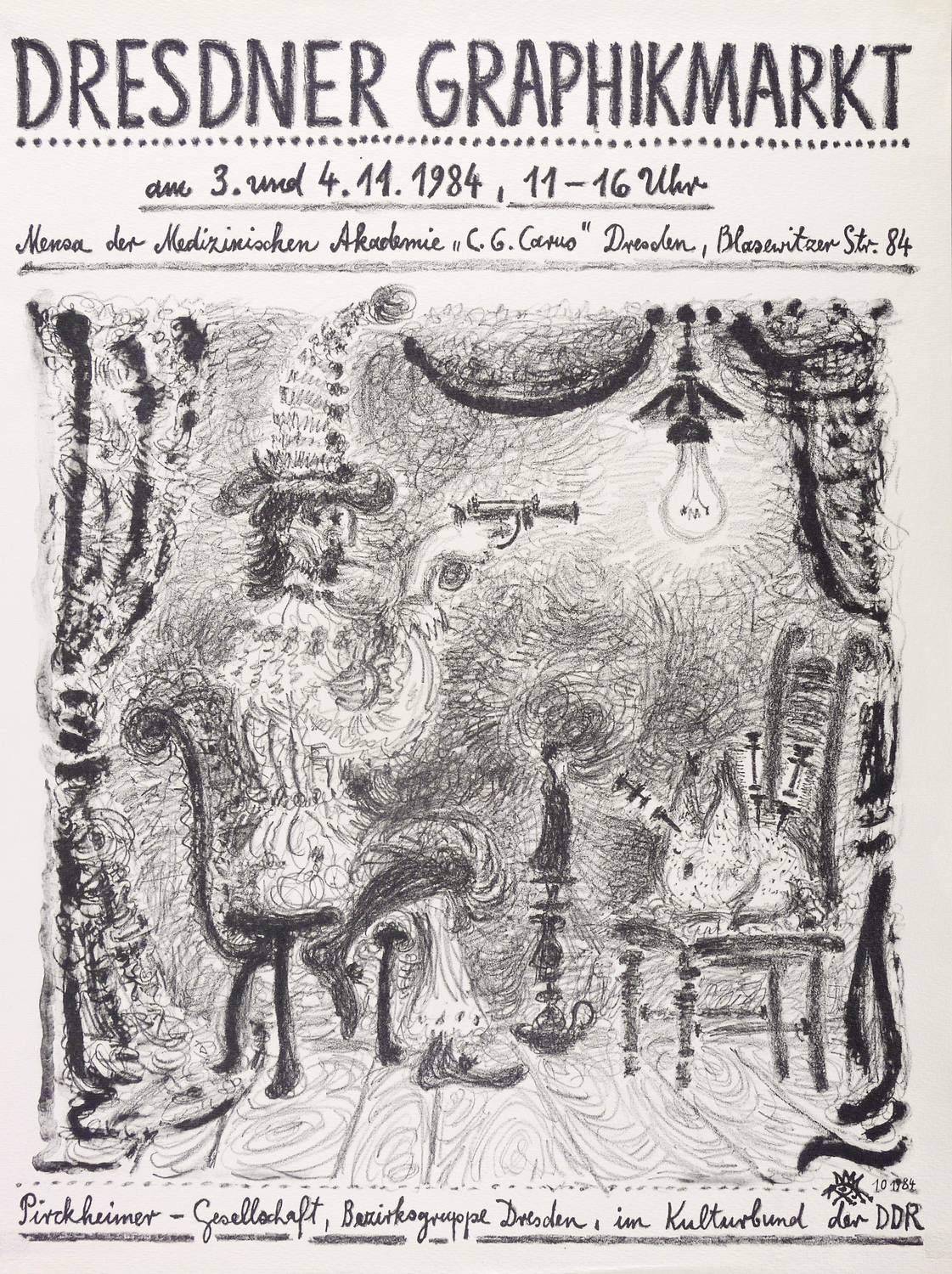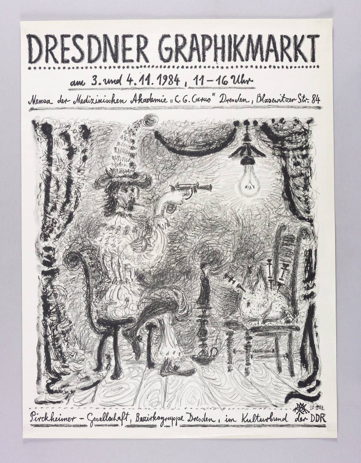 Nicht handsigniert. Im Stein rechts unten Künstler-Signet und Datum: ″10 1984″. – Originales Künstlerplakat zum ″Dresdner Graphikmarkt″ am 3./4.11.1984 in der Mensa der Medizinischen Akademie ″Carl Gustav Carus″ in Dresden, veranstaltet von der Pirckheimer-Gesellschaft Dresden. – Provenienz: Sammlung Gerlint und Gert Söder, Dresden – Sehr guter Zustand.