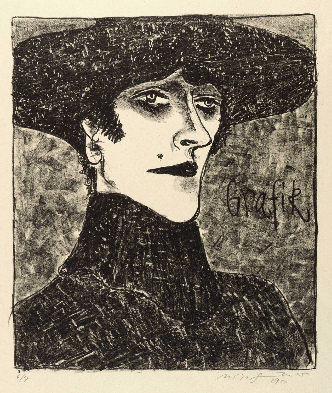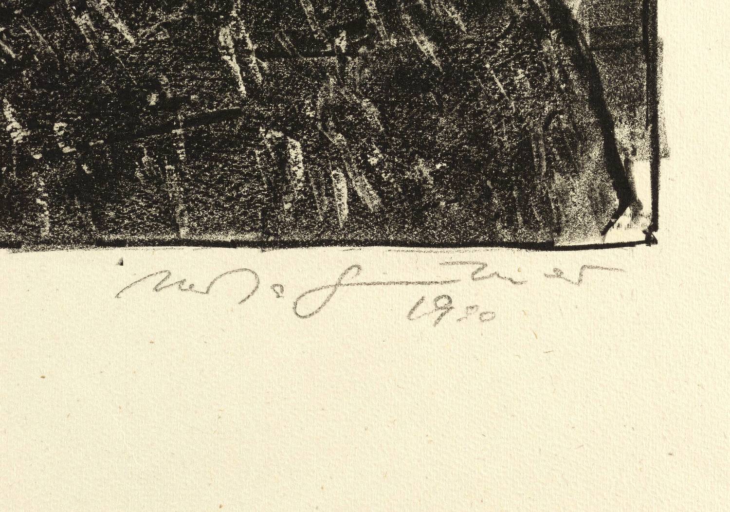 Schmidt 395. – Links unten in Bleistift signiert. Dazu Auflagenbezeichnung. In der Platte rechts unten zusätzlich Signatur und Jahr. – Ursprünglich als originalgrafisches Ausstellungsplakat konzipiert wurde dieses Motiv in kleiner Auflage ohne den Plakattext als Farbvariante in Grau-Schwarz statt in Gelb-Schwarz gedruckt. - Im WVZ von Manfred Schmidt unter dem wenig aussagekräftigen Titel ″Ausstellungsplakat″ geführt. Die dortigen Angaben über die Auflagenhöhen ungenau. – Leichte Randmängel, geringe Knickspuren. Sonst guter Zustand.