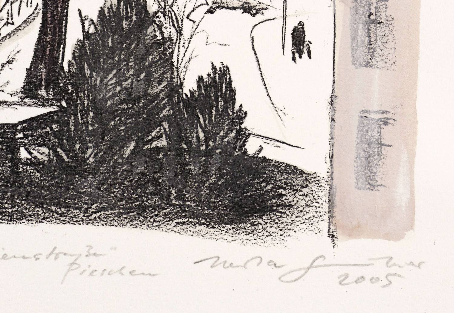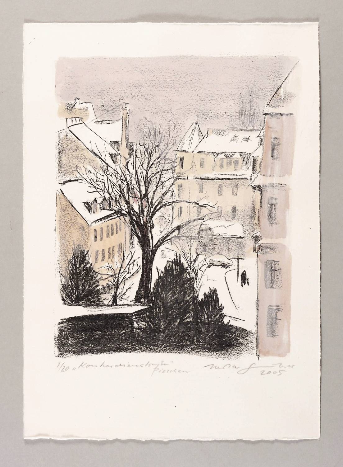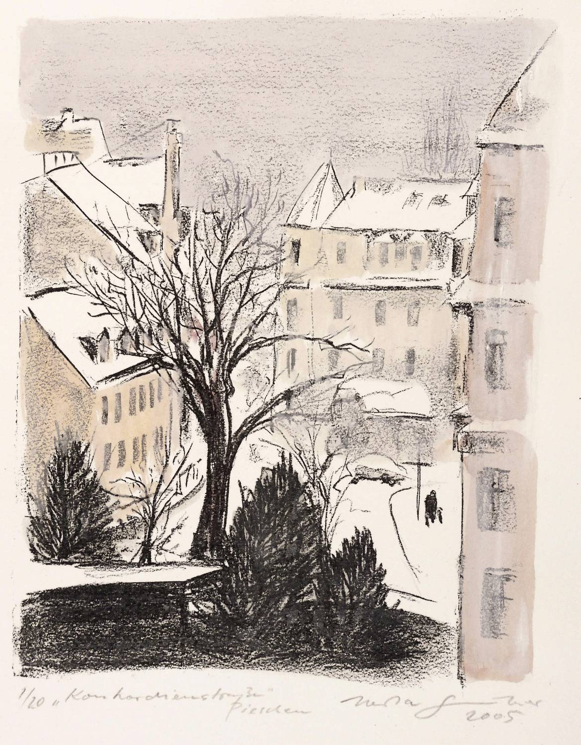 2005. Zinkografie / Kreidezinkografie, in Schwarz, in Aquarell überarbeitet, auf BFK-Rives-Bütten. – Originale Künstlergrafik, von Herta Günther. – Auflage Exemplar Nr. 1/20 (unikate Farbvariante). – 23,4 x 19,0 cm (Darstellung / Druckbild), 31,5 x 22,5 cm (Blatt).