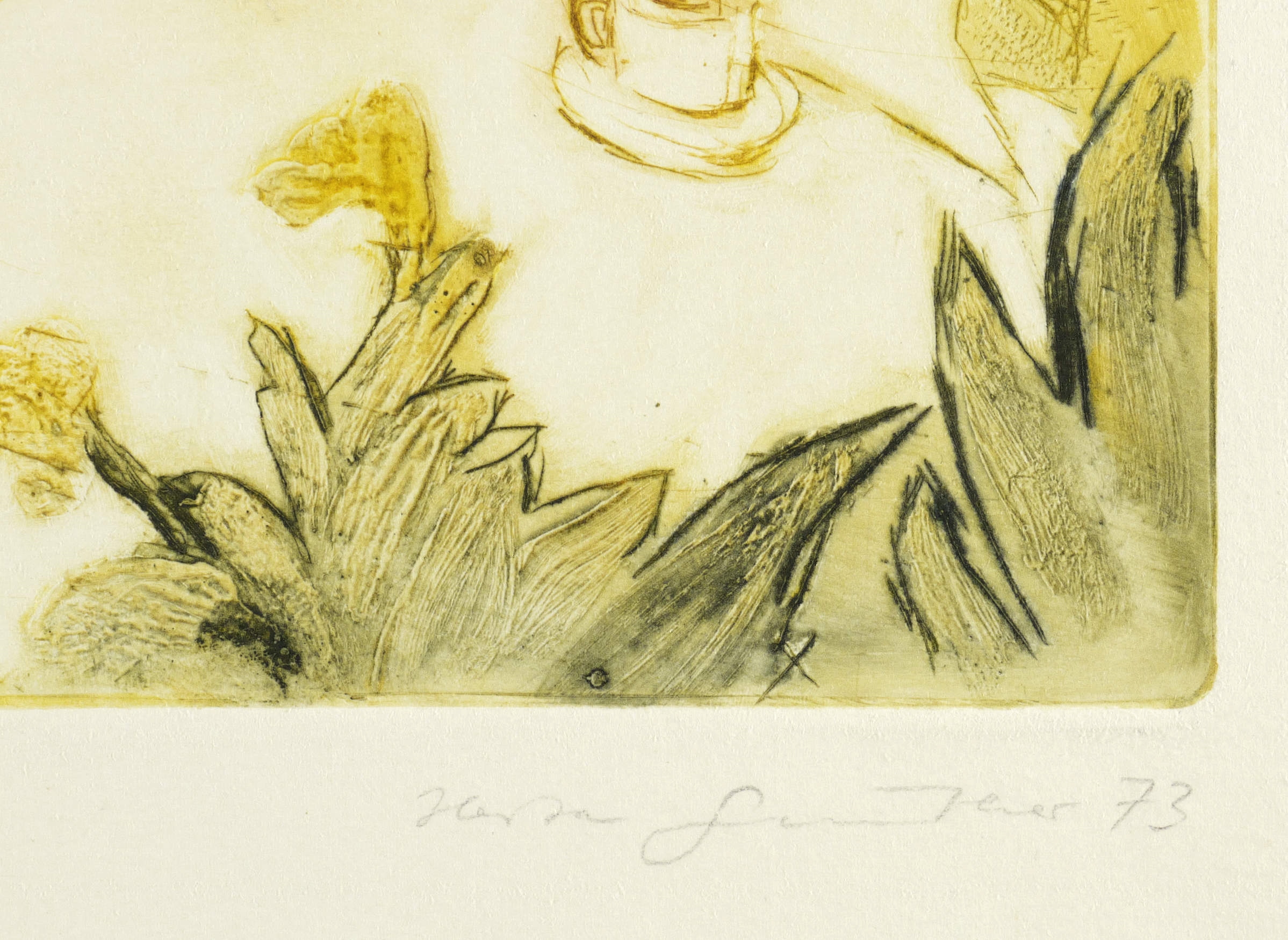 1973. Farbradierung / Kaltnadel & Aquatinta, in 3 Farben, auf gelbem Velinkarton. – Originale Künstlergrafik, von Herta Günther. – Künstlerexemplar (e.a.) Nr. 1. – 30,9 x 27,3 cm (Darstellung / Platte), 46,5 x 35,5 cm (Blatt).