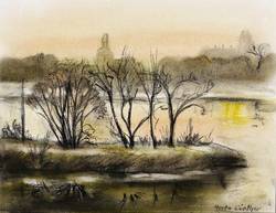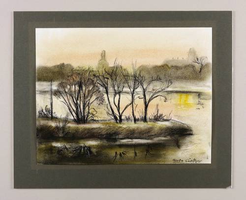 Rechts unten in schwarzer Kreide signiert: ″Herta Günther″. – Blick vom Pieschener Hafen über die Elbe Richtung Ostra-Gehege und Dresden- Friedrichstadt mit dem Schweinedom links und der Hafenmühle am Alberthafen rechts. – Von der Künstlerin original auf grauem Passepartoutkarton montiert. Sehr guter Zustand.