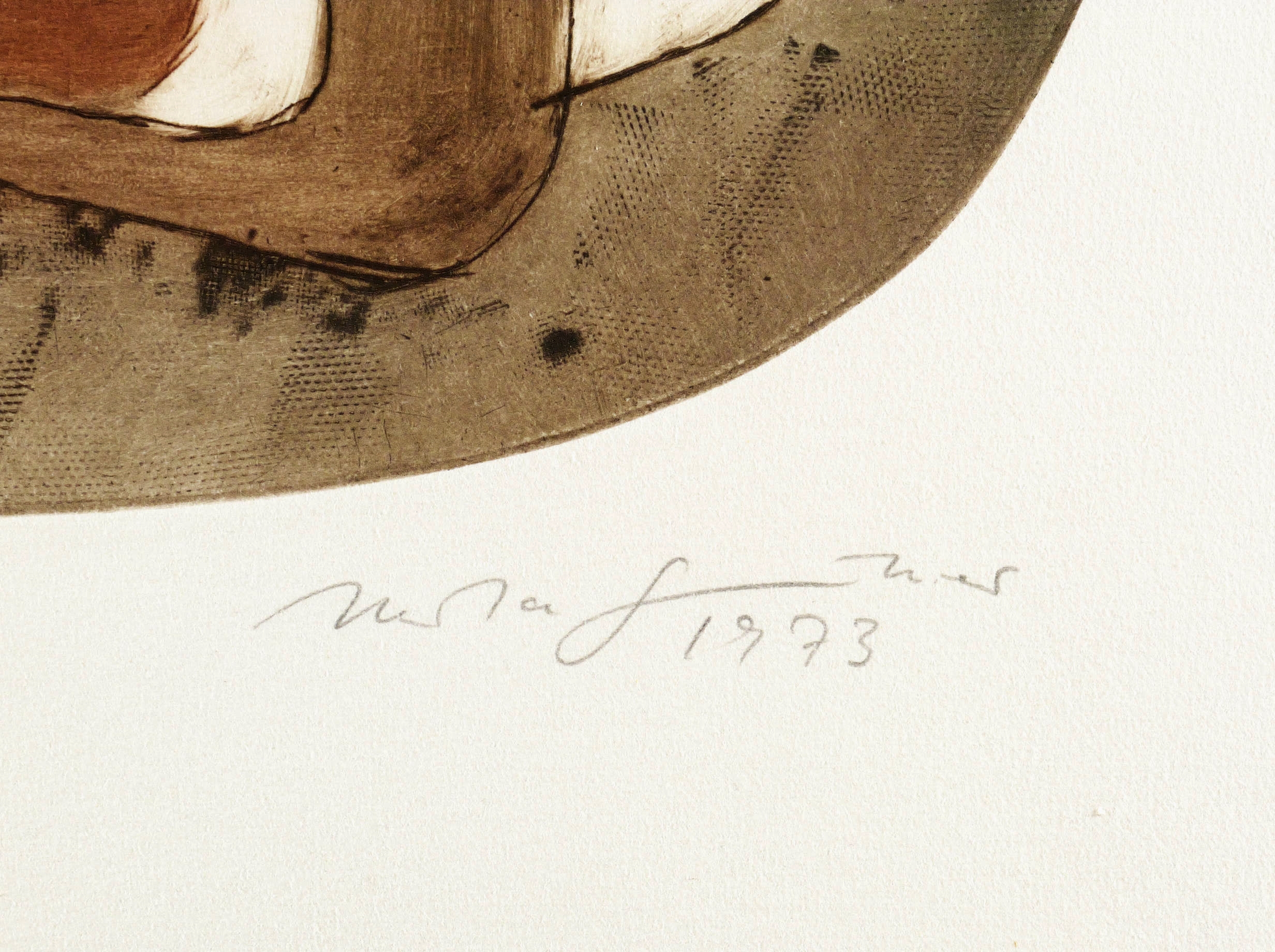 1973. Farbradierung / Vernis mou & Kaltnadel, in 6 Farben, auf schwerem hellchamois Hahnemühle-Bütten. – Originale Künstlergrafik, von Herta Günther. – Auflage Exemplar Nr. 19/25. – 29,3 x 29,3 cm (Darstellung / Oval), 49 x 39 cm (Blatt).