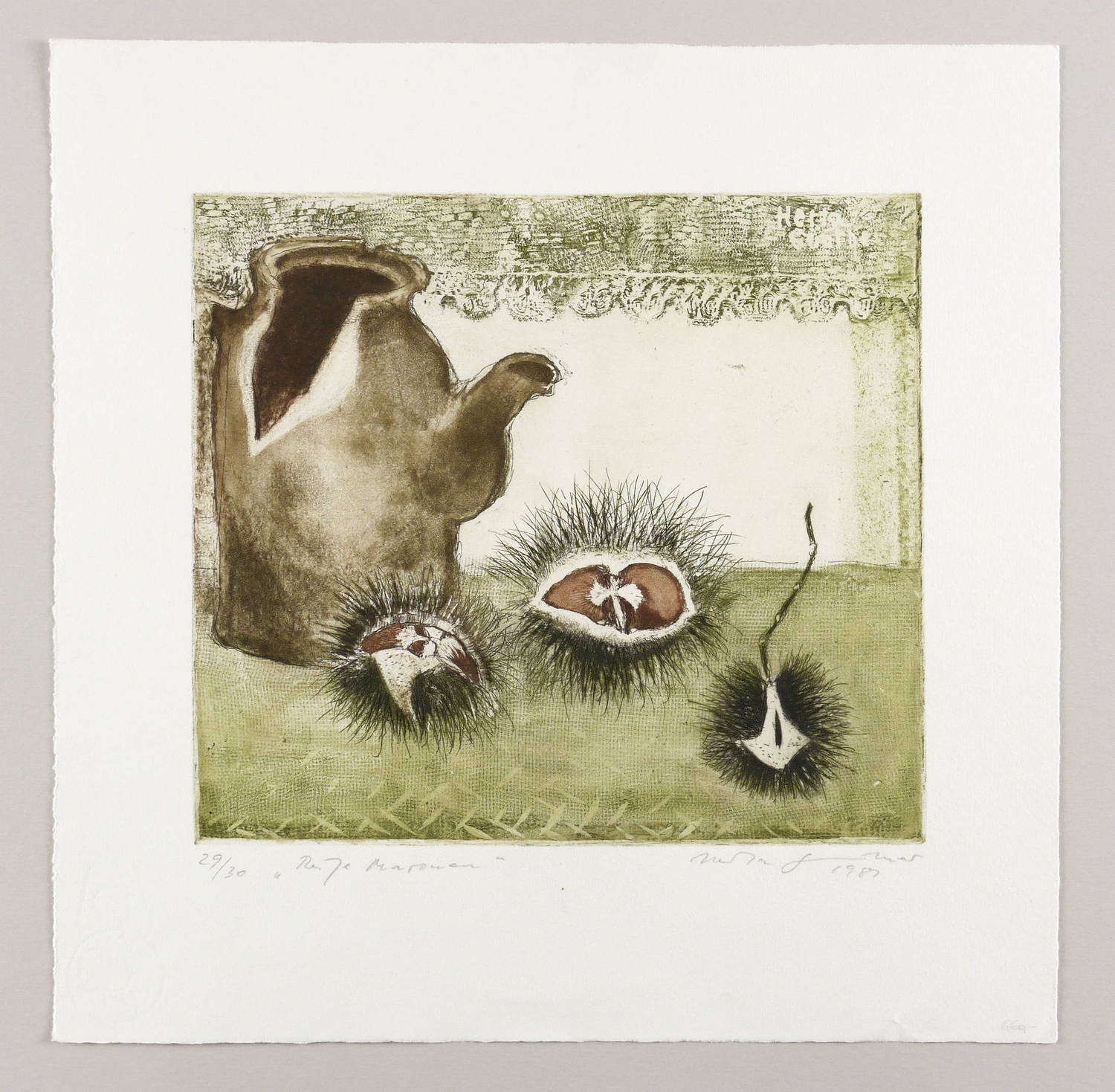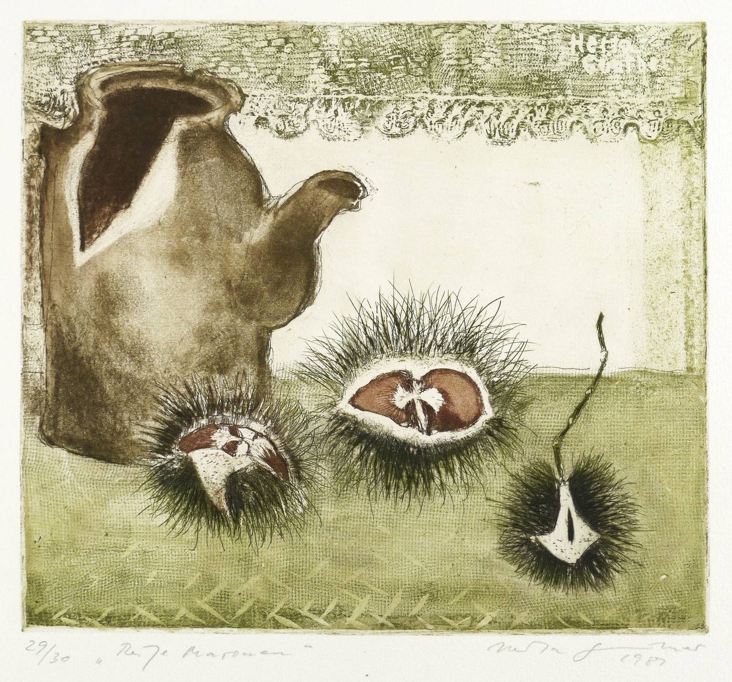 Schmidt 405. – Rechts unten in Bleistift signiert und datiert: ″Herta Günther 1981″. Links Auflagenbezeichnung und Titel: ″29/30 / Reife Maronen″. – Handabzug der Künstlerin. – Oroginalrandig, im Rand minimal knickspurig. Schön erhaltenes Kolorit. Guter Zustand.