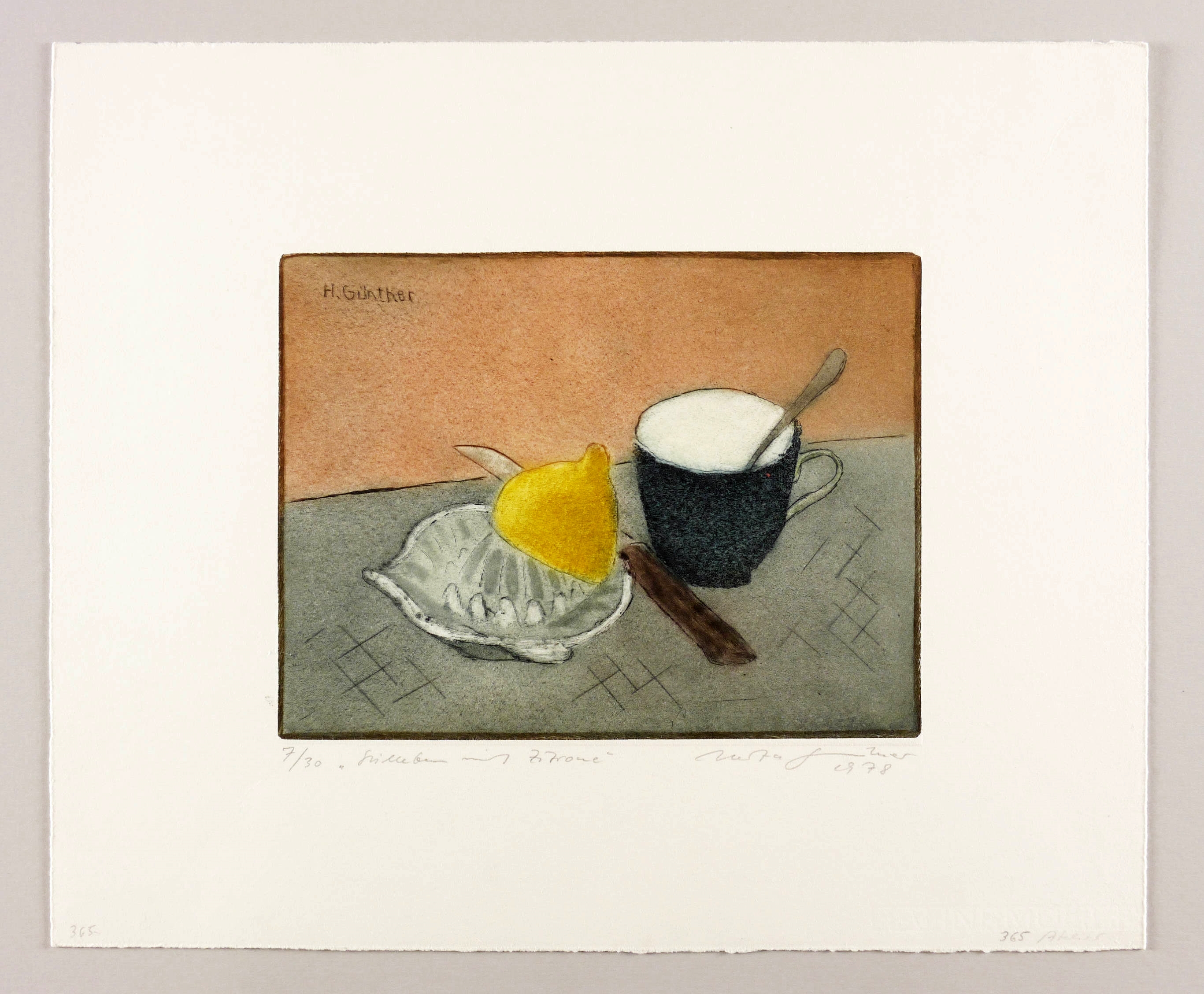 Schmidt 365. – Rechts unten in Bleistift signiert und datiert: ″Herta Günther 1978″. Links Auflagenbezeichnung: ″7/30″. Dazu Titel: ″Stilleben mit Zitrone″. In den unteren Blattecken jeweils Werkverzeichnis-Nr. Rechts weiter bezeichnet: ″Atelier″. – Schönes charakteristisches Blatt. – Tadellos erhalten. Sehr guter Zustand.