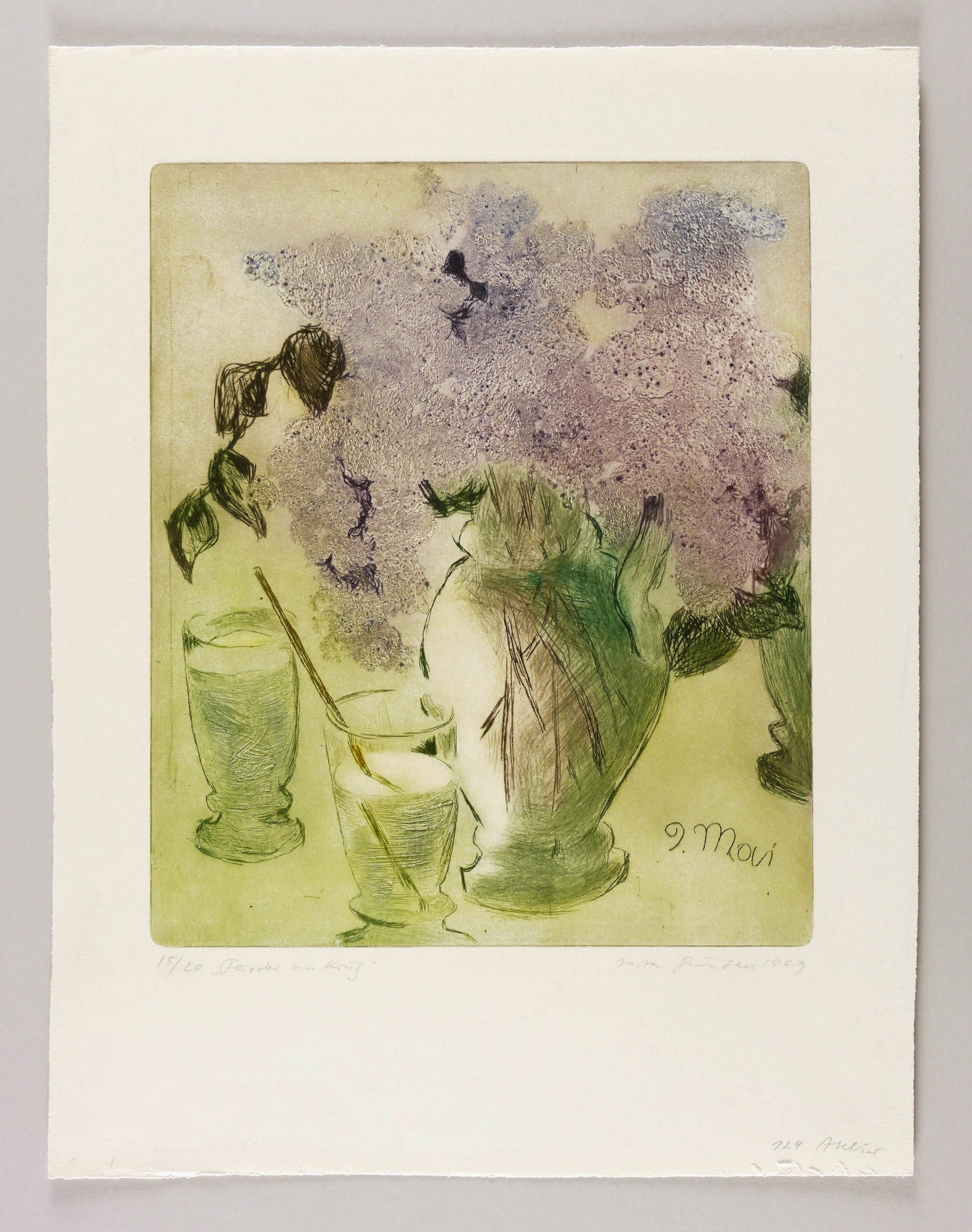 Schmidt 124. – Rechts unten in Bleistift signiert und datiert: ″Herta Günther 1969″. Links Auflagenbezeichnung: ″15/20″. Dazu Titel: ″Flieder im Krug″. In der Blattecke rechts unten weiter bezeichnet: ″124 / Atelier″. In der Platte rechts unten datiert: ″9. Mai″. – Sehr malerisch veranlagtes Blatt. Seltenes frühes Blatt. – Ohne Mängel. Sehr guter Zustand.
