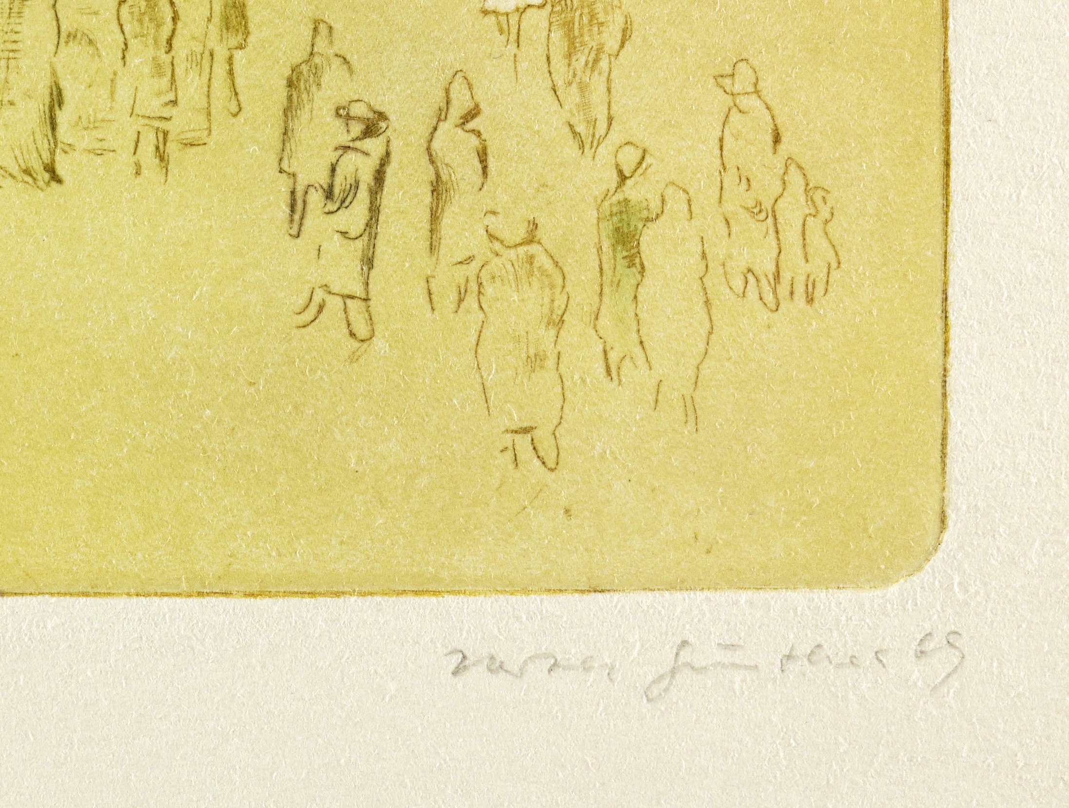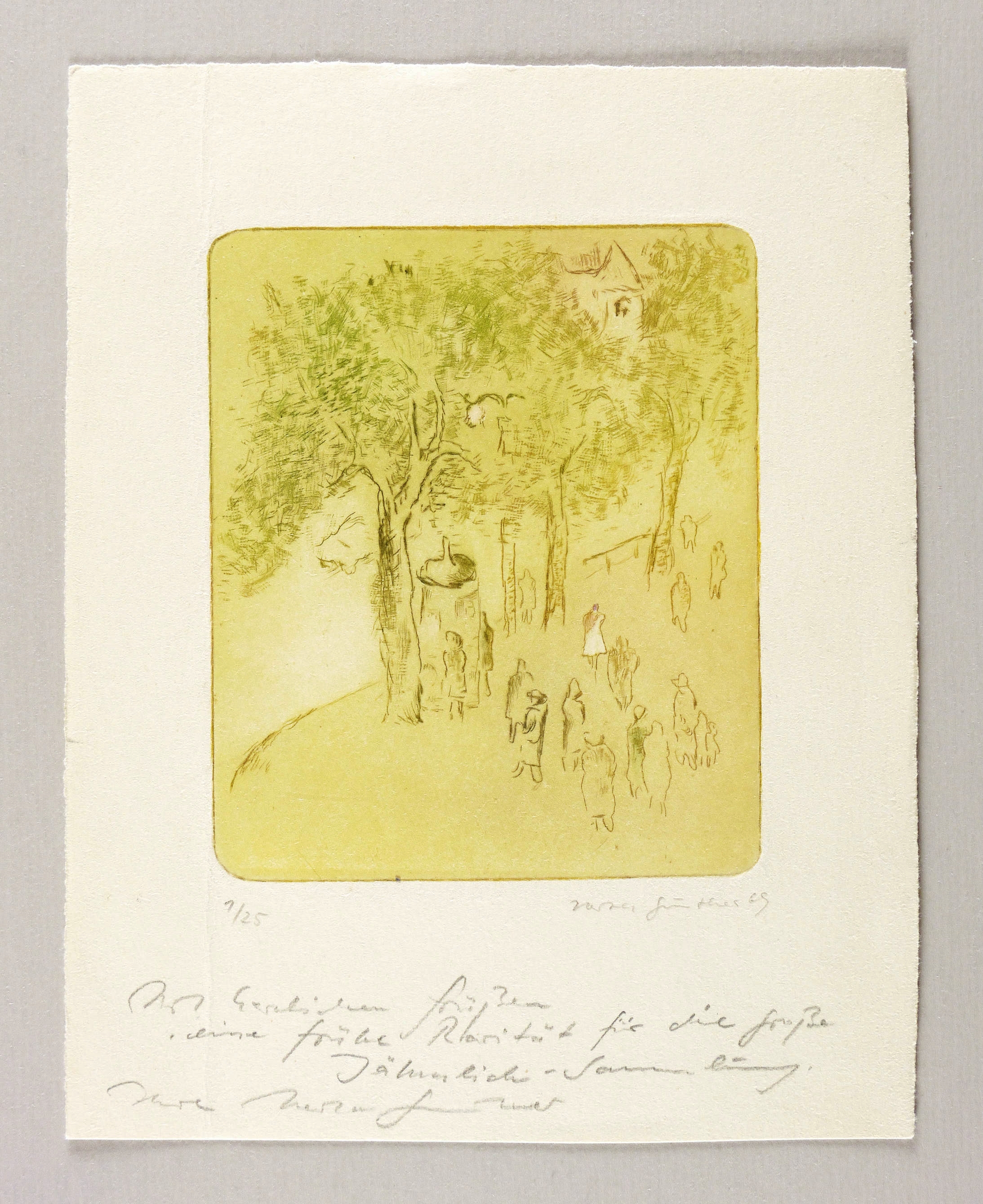 1969. Farbradierung / Kaltnadel, in 3 Farben, auf hellgelbem Velinkarton. – Originale Künstlergrafik, von Herta Günther. – Auflage Exemplar Nr. 1/25. – 12,9 x 10,8 cm (Darstellung / Platte), 22 x 17 cm (Blatt).