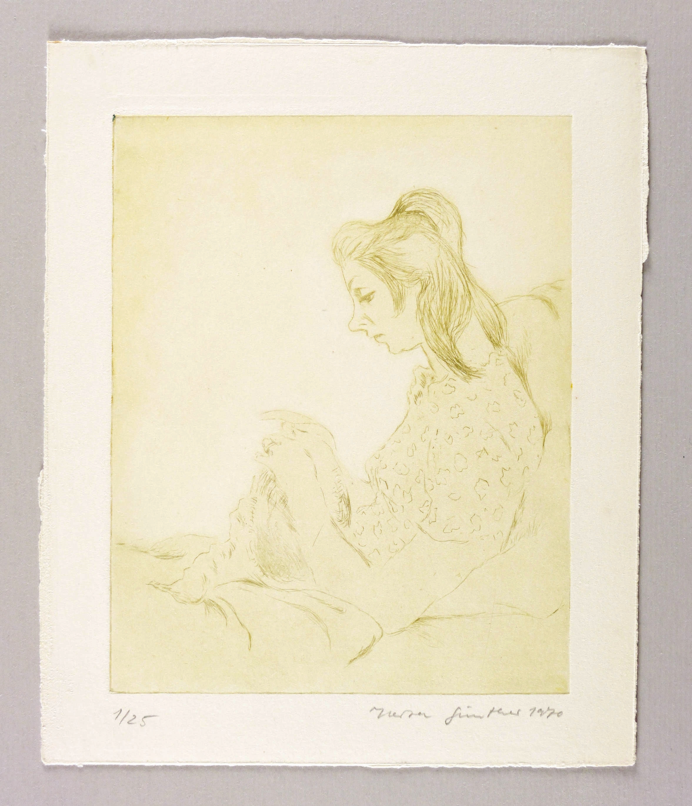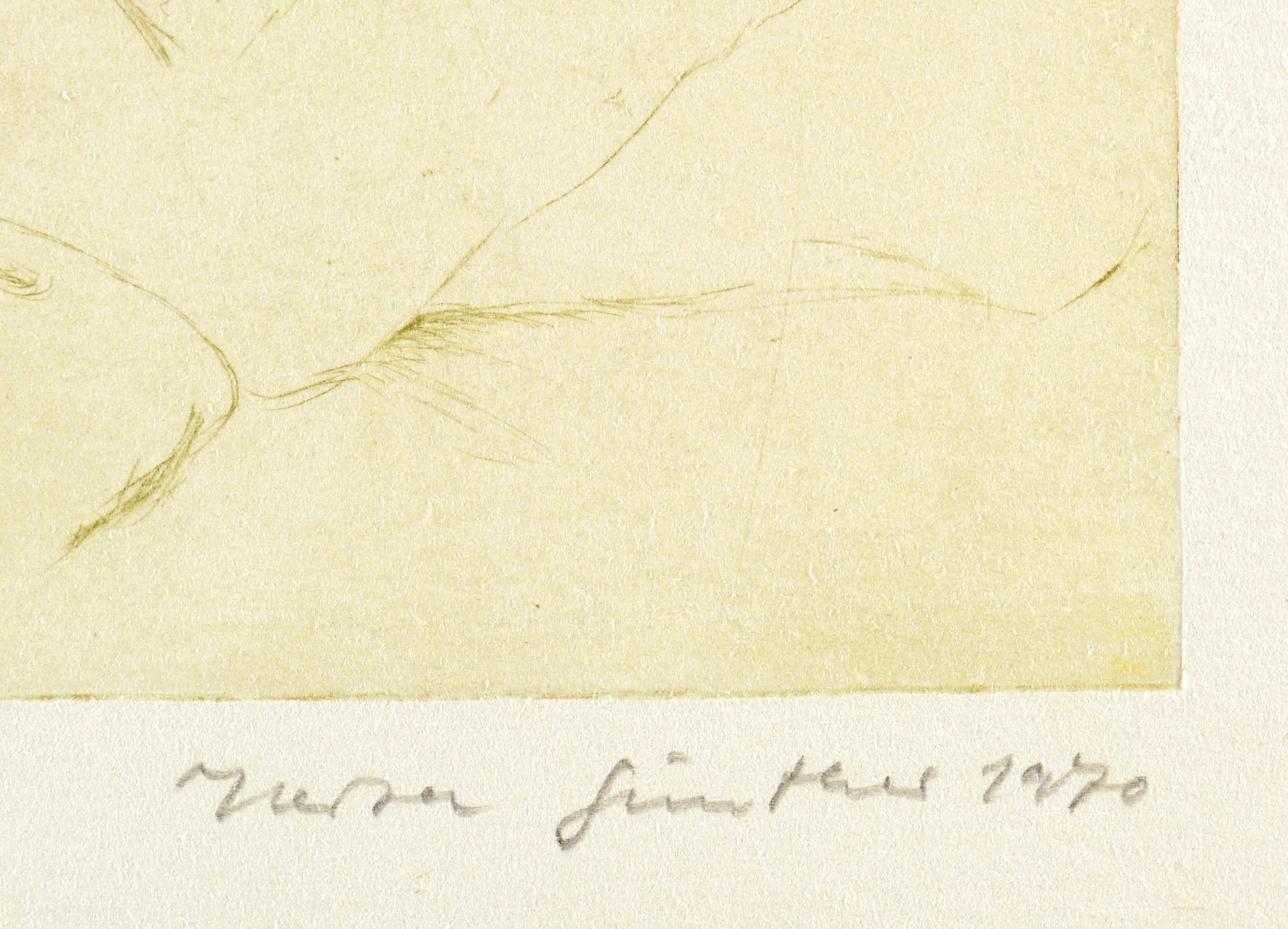 1970. Radierung / Kaltnadel, in Grün, auf hellgelbem Velinkarton. – Originale Künstlergrafik, von Herta Günther. – Auflage Exemplar Nr. 1/25. – 18,8 x 15,0 cm (Darstellung / Platte), 24 x 20 cm (Blatt).