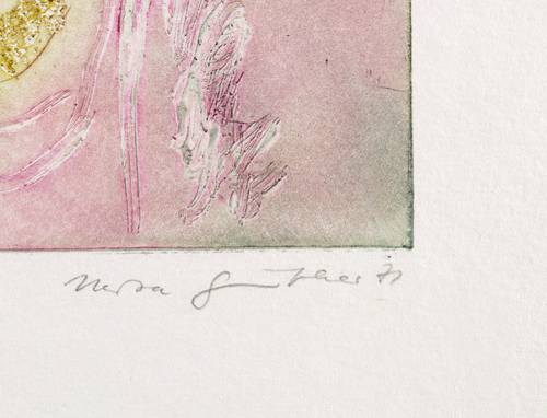 1971. Farbradierung / Reservage & Kaltnadel, in 6 Farben, auf festem gelbem Velin. – Originale Künstlergrafik, von Herta Günther. – Auflage Exemplar Nr. 9/15. – 18,8 x 15,2 cm (Darstellung / Platte), 31 x 23 cm (Blatt).
