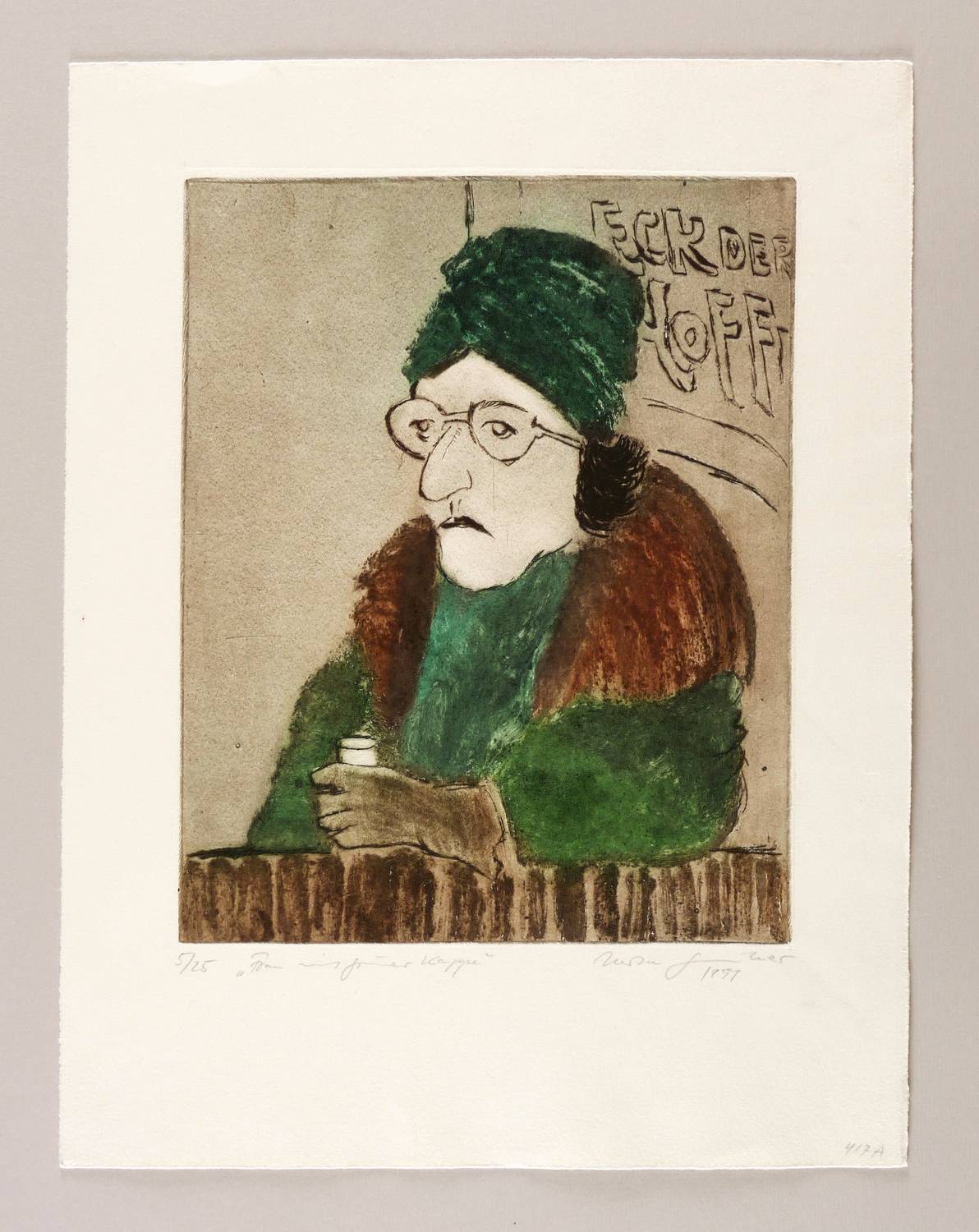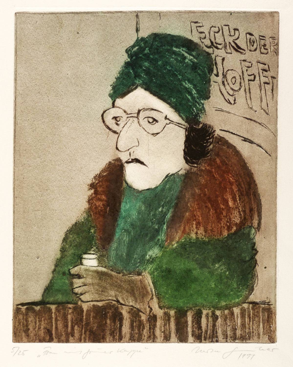 Schmidt 417. – Rechts unten in Bleistift signiert: ″Herta Günther 1981″. Links Auflagenbezeichnung und Titel: ″5/25 'Frau mit grüner Kappe'″. Rechte untere Blattecke mit Werk-Nr. – Minimale Lagerspuren. Insgesamt guter Zustand.