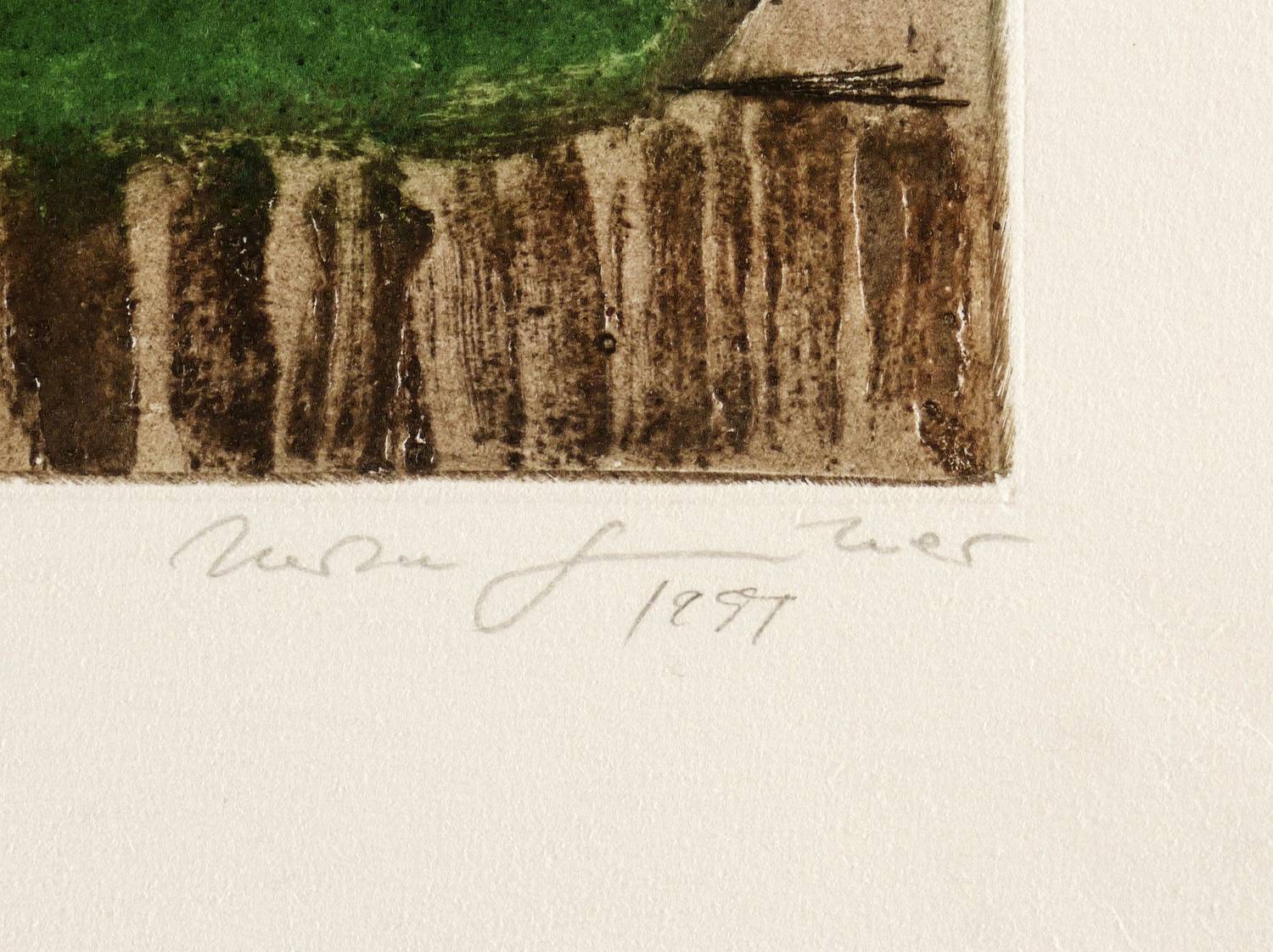 1981. Farbradierung / Vernis mou, Aquatinta & Kaltnadel, in 4 Farben, auf rauem hellchamois Velin. – Originale Künstlergrafik, von Herta Günther. – Auflage Exemplar Nr. 5/25. – 32,6 x 26,0 cm (Darstellung / Platte), 47 x 36 cm (Blatt).