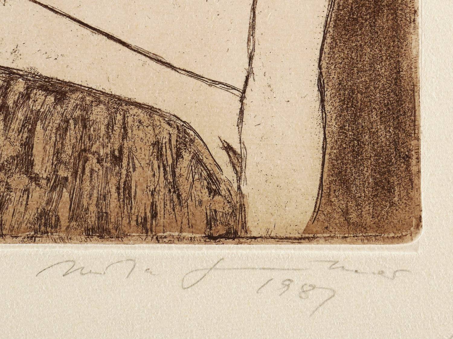 1981. Radierung / Vernis mou, Strichätzung & Aquatinta, in Violett-Braun, auf schwerem chamois Velin. – Originale Künstlergrafik, von Herta Günther. – Künstlerexemplar (e.a.) Nr. 1. – 32,4 x 37,0 cm (Darstellung / Platte), 39 x 44 cm (Blatt).