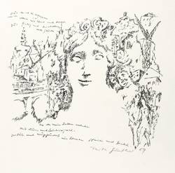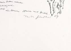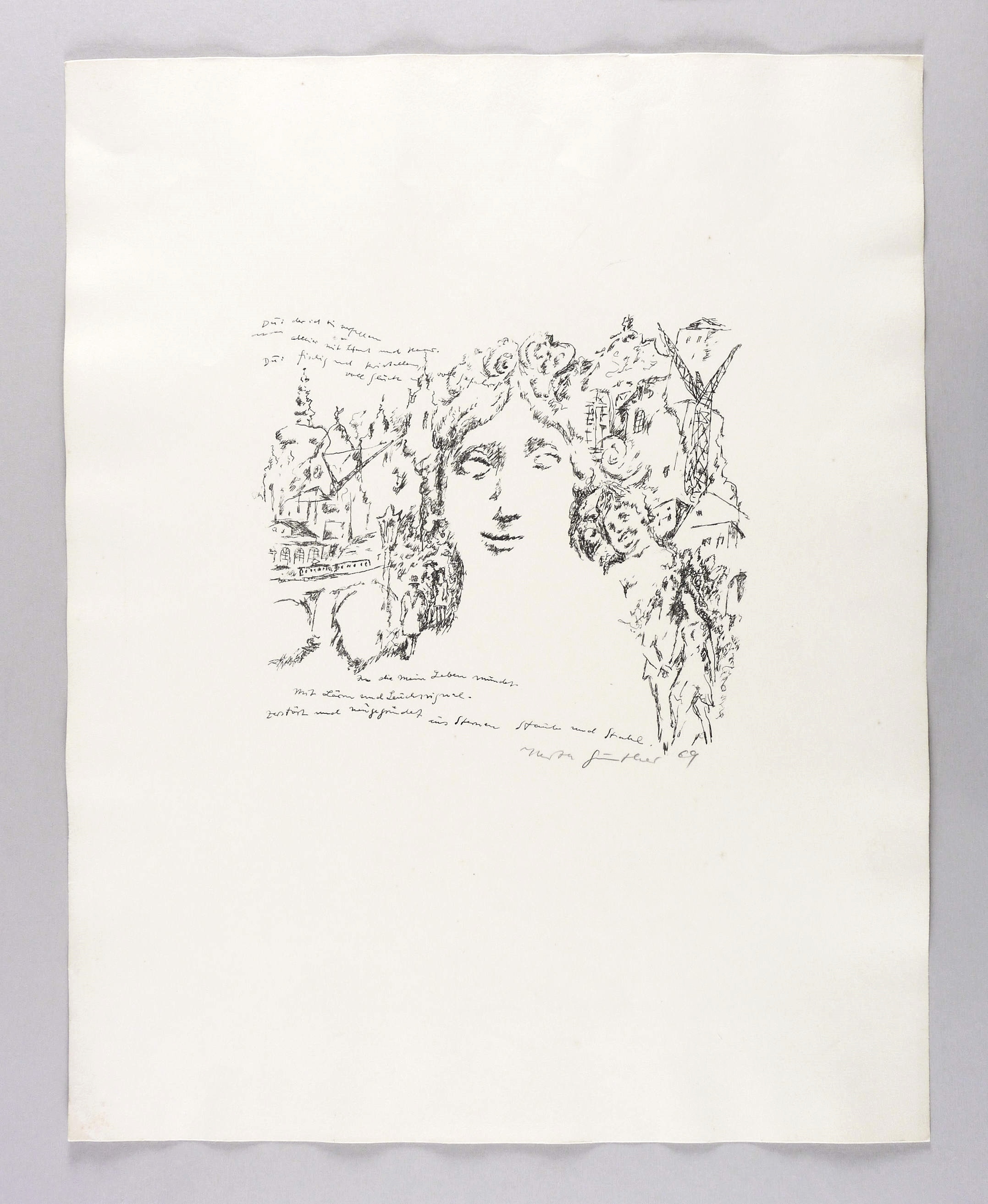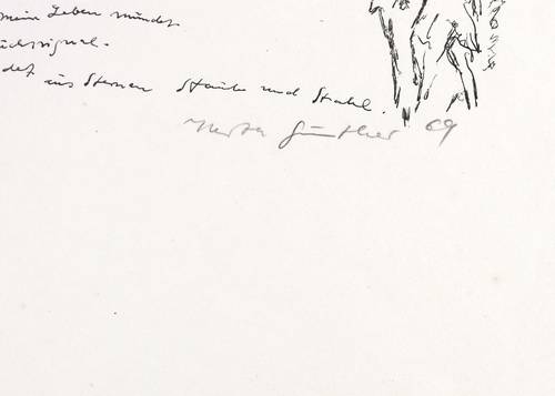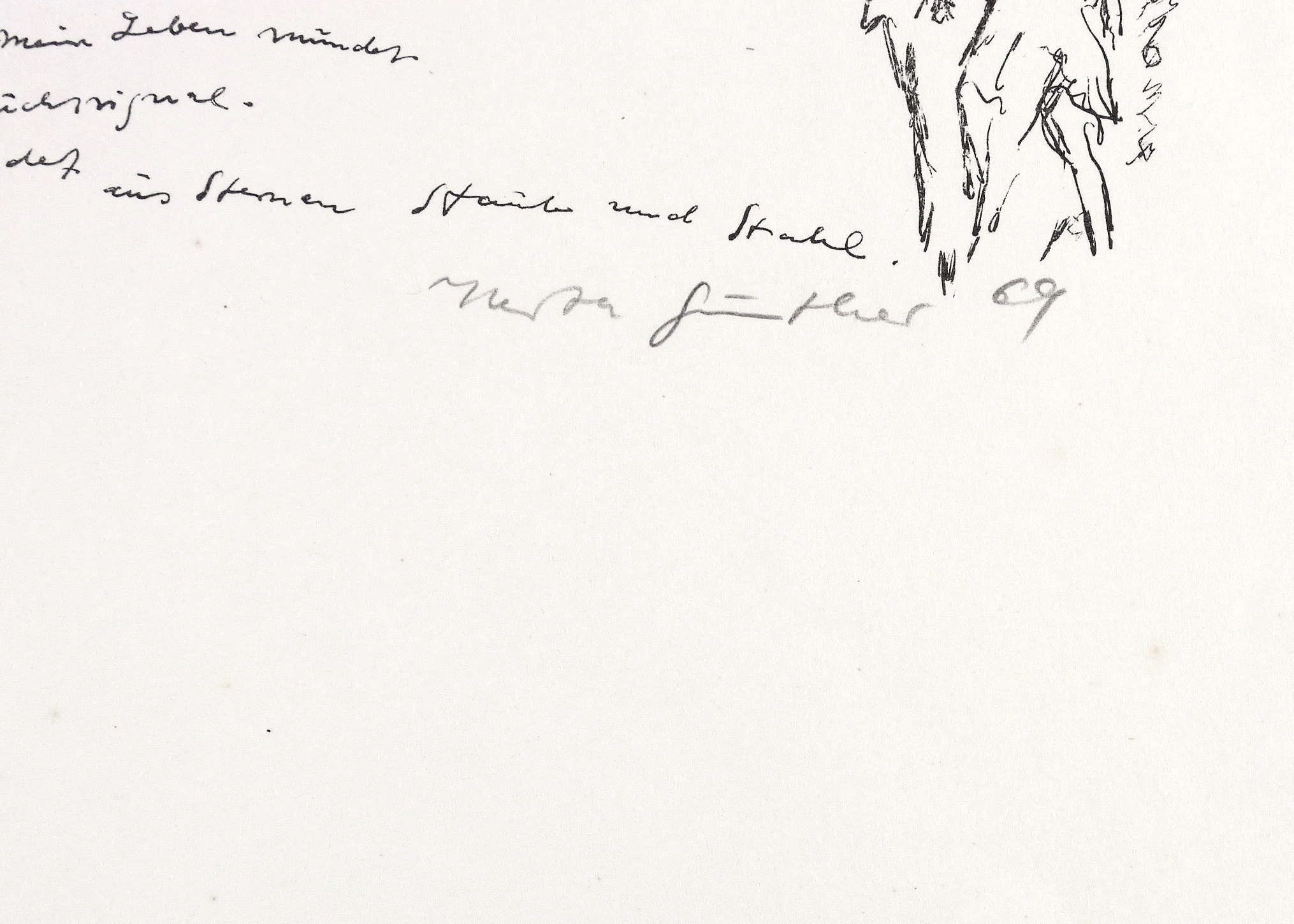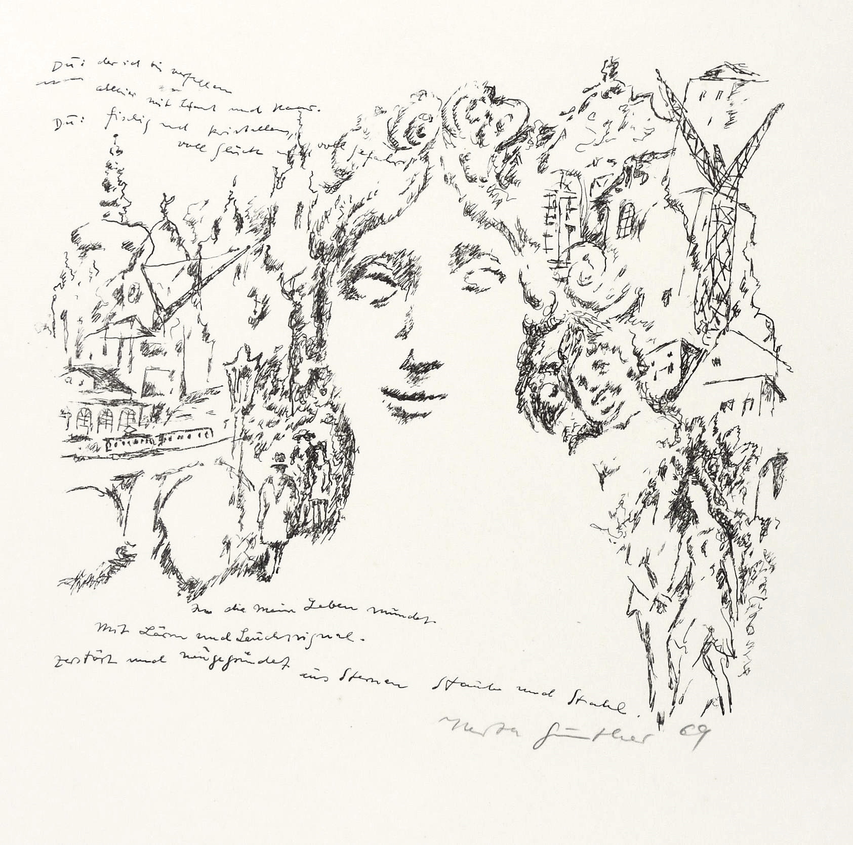 Schmidt 149. – Rechts unten in Bleistift signiert und datiert. Im Stein die Inschrift: ″Du, der ich bin verfallen; deiner mit Haut und Haar. Du: fischig und kristallen, voll Glück und voll Gefahr; In die mein Leben mündet mit Lärm und Leuchtsignal. Zerstört und neugegründet aus Sternen Staub und Stahl.″ – Zu dem gleichnamigen Gedicht von Manfred Streubel. – Blattecken bisweilen etwas bestoßen. Sonst guter Gesamtzustand.