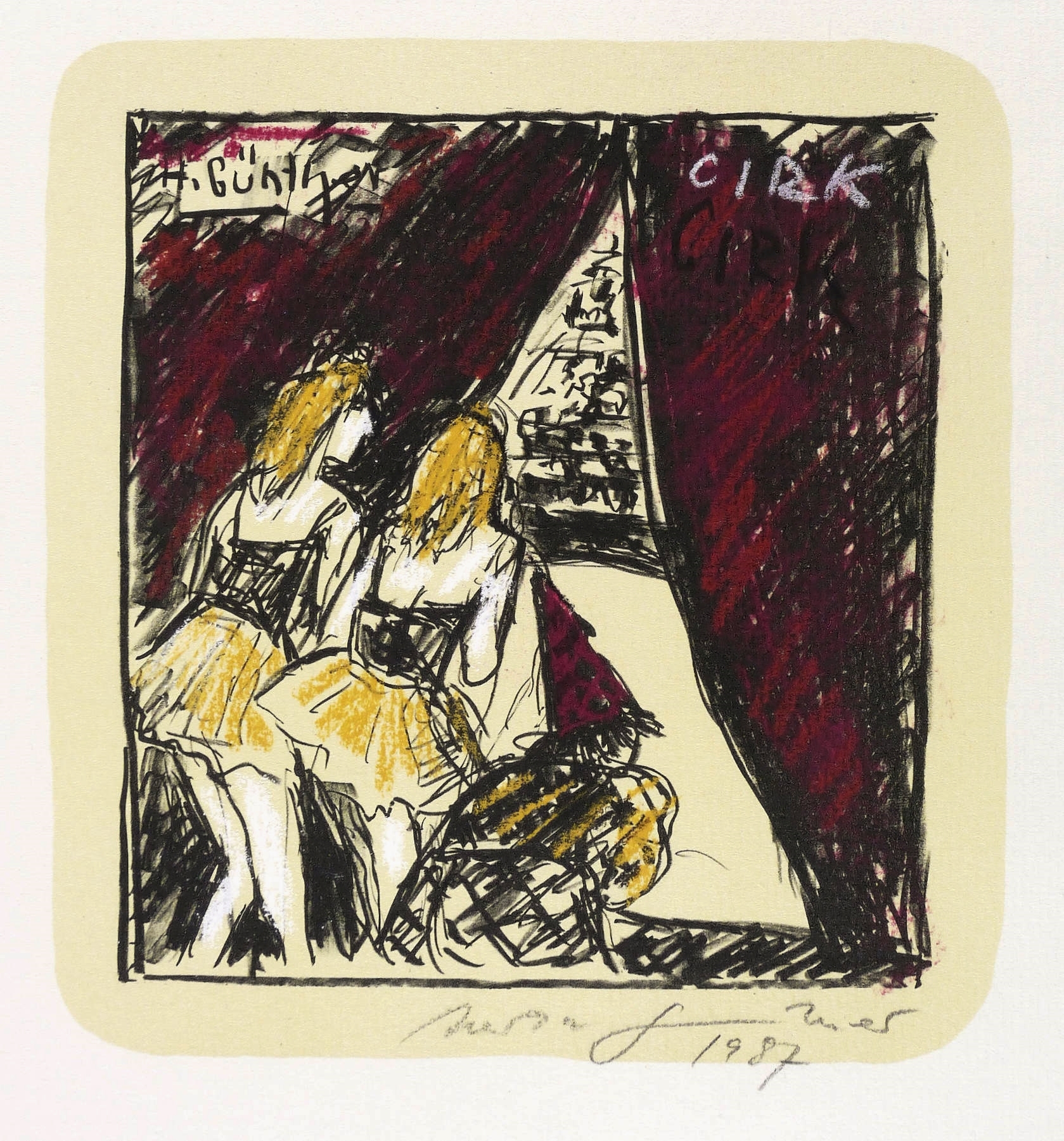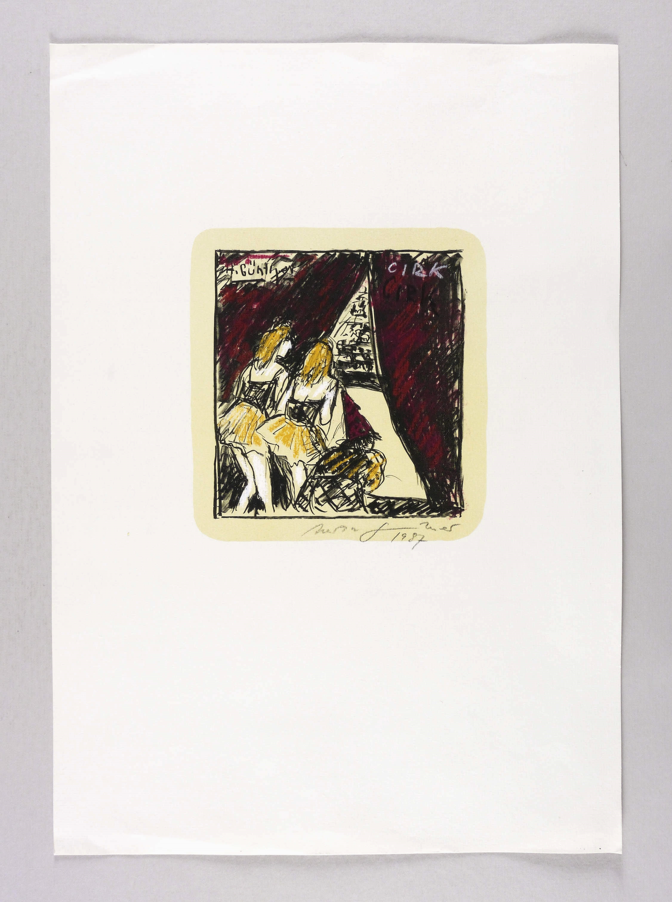 Rechts unten in Bleistift signiert und datiert: ″Herta Günther 1987″. In der Darstellung rechts oben in Kreide Titel: ″CIRK″. In der Platte links oben Signatur. – Ohne Mängel. Sehr guter Zustand.