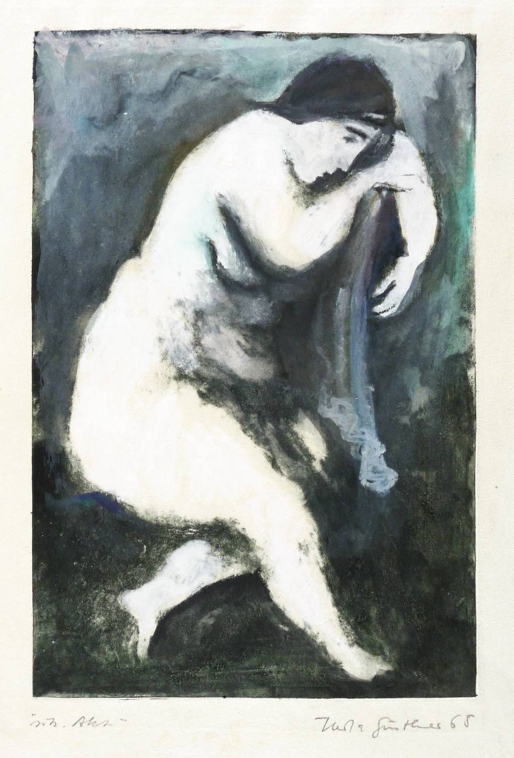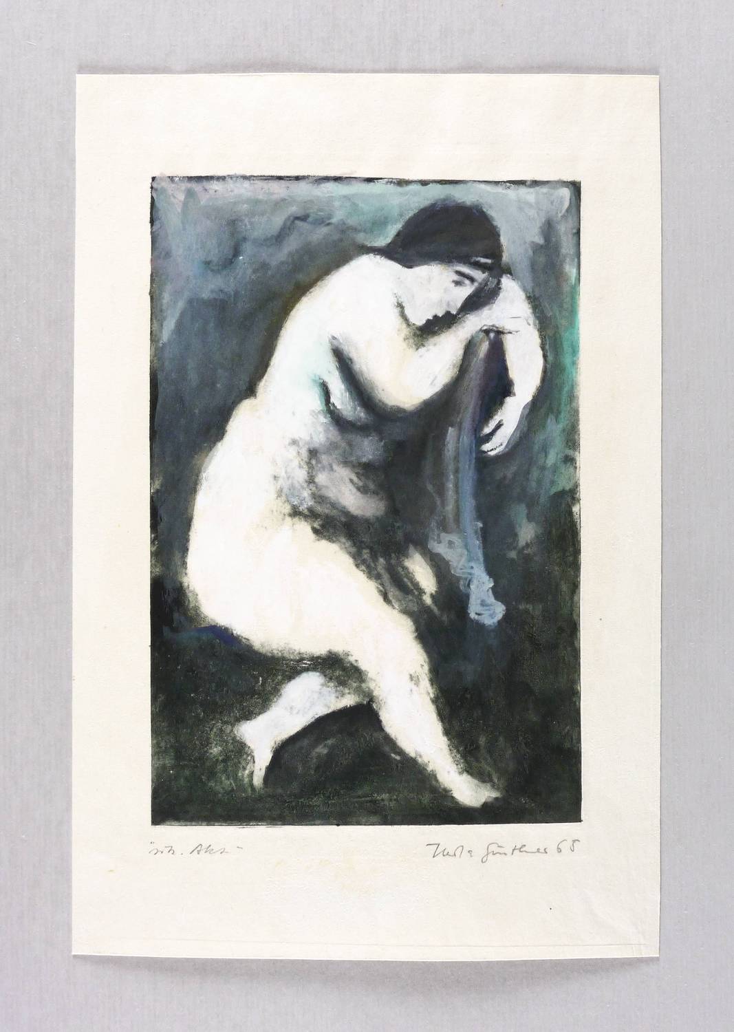 Rechts unten in Bleistift signiert und datiert: ″Herta Günther 65″. Links Titel: ″Sitz. Akt″. – Die zugrundeliegende Aquatinta-Radierung aus dem Jahr 1964 nicht bei Schmidt. – Sehr gut erhalten.