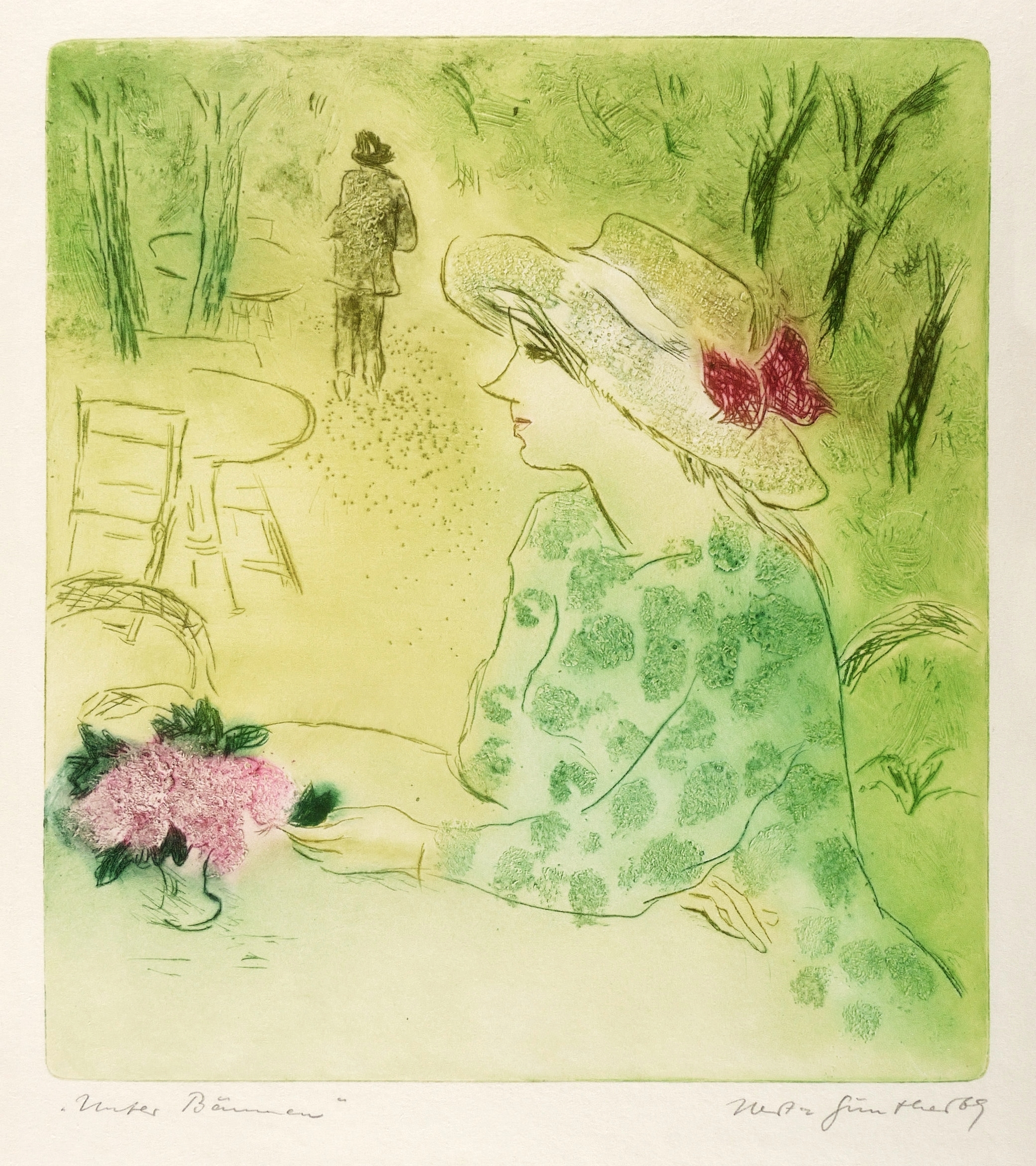 Schmidt 129. – Rechts unten in Bleistift signiert und datiert: ″Herta Günther 69″. Links Titel: ″Unter Bäumen″. In der linken unteren Blattecke Auflagenbezeichnung: ″6/25″. – Sehr guter Zustand.
