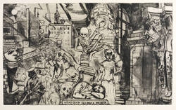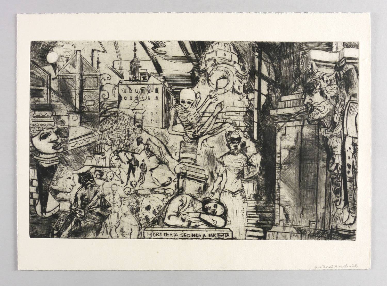 Lau 126. – Rechts unten von der Witwe Charlotte Hassebrauk in Bleistift signiert: ″p.m. Ernst Hassebrauk″. Verso bezeichnet: ″aus den Dresdner Visionen″. – Posthumer Abzug von der originalen Platte für die Witwe Charlotte Hassebrauk. Druck 1980 von Ernst Lau. - Provenienz: Sammlung Dr. Ingrid und Prof. Dr. Albrecht Scholz, Dresden. – Sehr guter Zustand.
