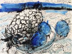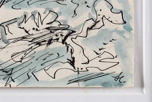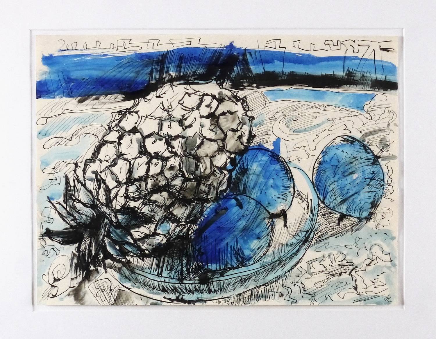 Um 1960. Zeichnung / Federzeichnung, in Tusche in Blau & Schwarz, auf hellchamois Velinkarton. – Originale Künstlergrafik, von Ernst Hassebrauk. – Unikat. – 29,7 x 40,0 cm (Darstellung / Blatt), 50 x 60 cm (Passepartout).