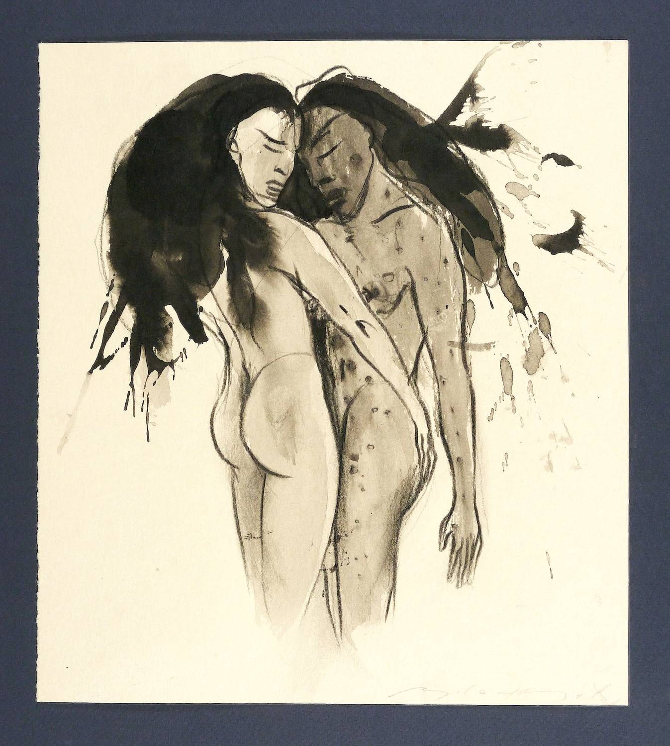 Um 2000. Zeichnung / Fettkreide & Tusche, in Schwarz & Grau laviert, auf hellchamois Velin. – Originale Künstlergrafik, von Angela Hampel. – Unikat. – 27,3 x 24,5 cm (Darstellung / Blatt).