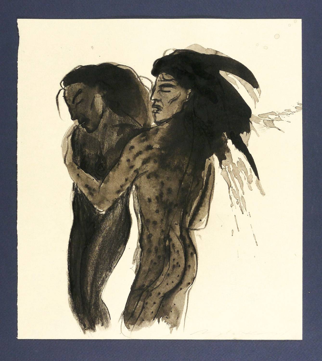 Um 2000. Zeichnung / Fettkreide & Tusche, in Schwarz, grau laviert, auf hellchamois Velin. – Originale Künstlergrafik, von Angela Hampel. – Unikat. – 27,4 x 24,4 cm (Darstellung / Blatt).