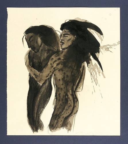 Angela Hampel (*1956 Räckelwitz, lebt und arbeitet in Dresden). Deutsche Malerin und Grafikerin. Lehre und Arbeit als Forstfacharbeiterin. 1977-82 Studium an der HfBK Dresden bei Jutta Damme und D. Büttner. Danach freischaffend. Mitbegründerin der Dresdner Sezession '89. Zahlreiche Einzelausstellungen u.a. in der Galerie Döbele. In ihren Figuren einen sich das Weibliche und das Männliche, das Menschliche und das Tierische, kämpfen gegen einander oder um einander - vital, agressiv und zärtlich zugleich.
