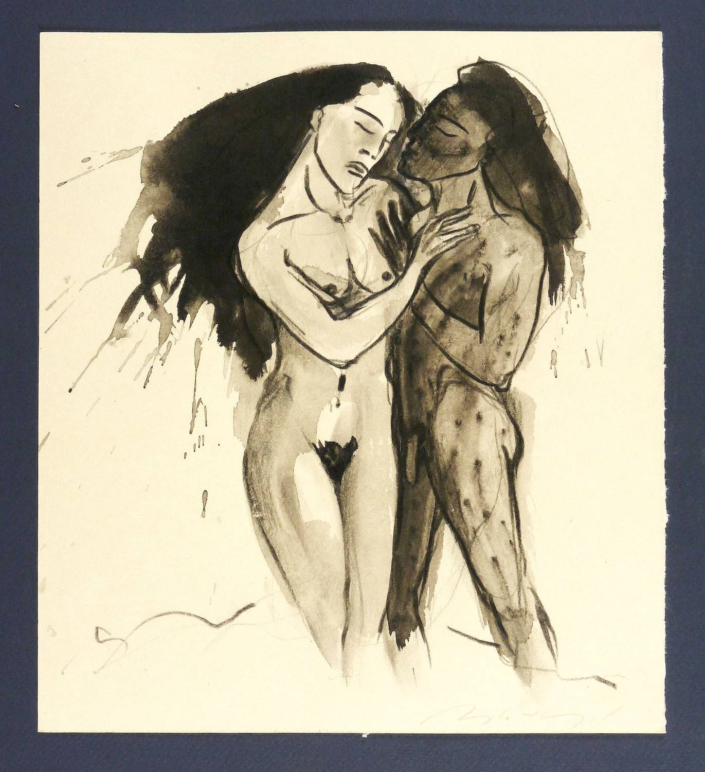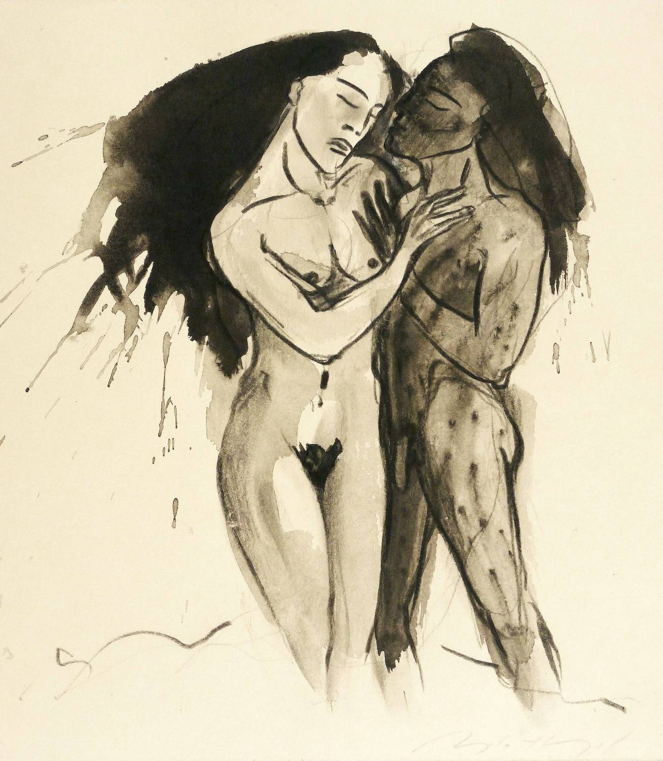 Um 2000. Zeichnung / Fettkreide & Tusche, in Schwarz, grau laviert, auf hellchamois Velin. – Originale Künstlergrafik, von Angela Hampel. – Unikat. – 27,3 x 24,5 cm (Darstellung / Blatt).