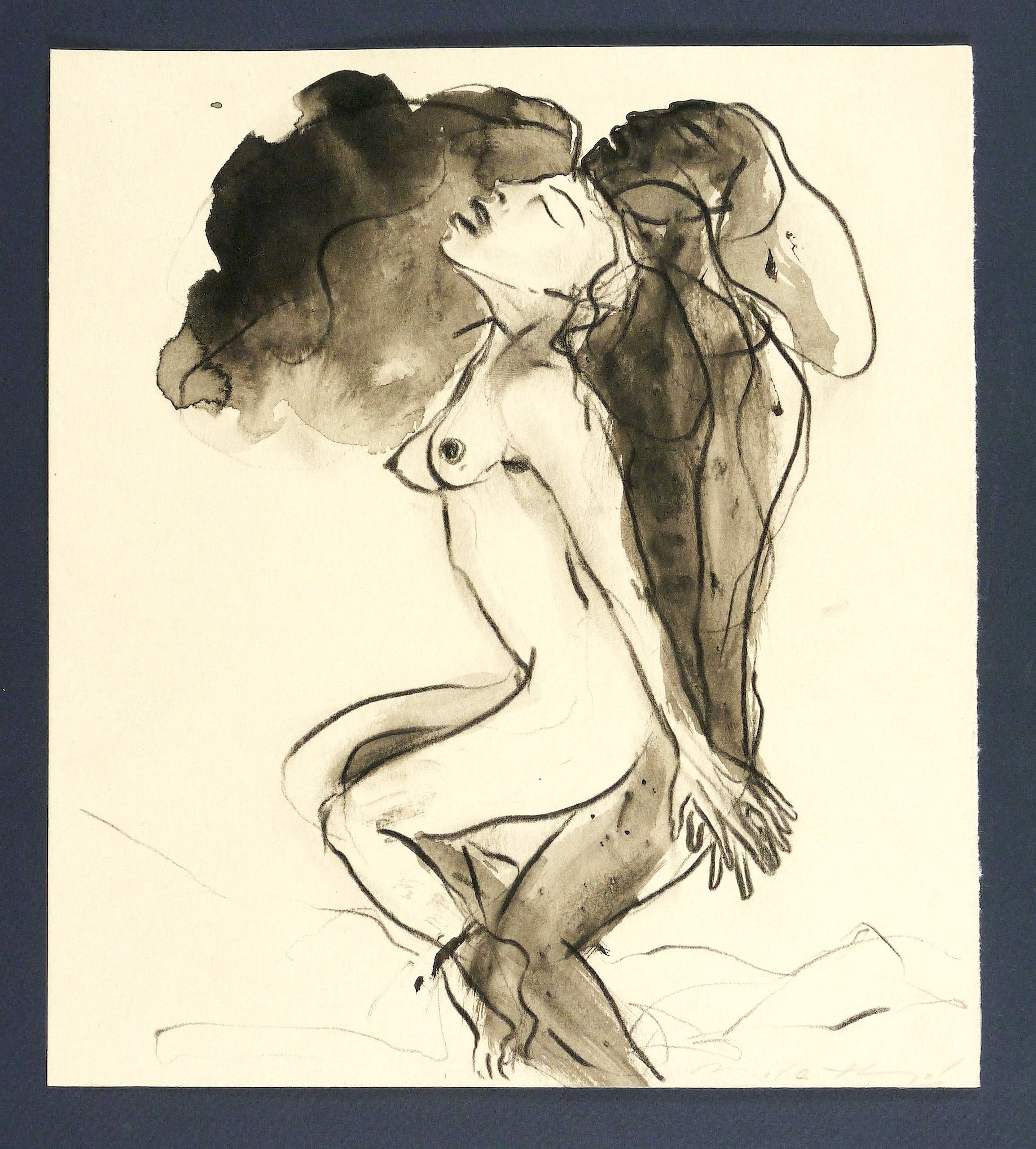 Um 2000. Zeichnung / Fettkreide & Tusche, in Schwarz, grau laviert, auf hellchamois Velin. – Originale Künstlergrafik, von Angela Hampel. – Unikat. – 27,3 x 24,3 cm (Darstellung / Blatt).