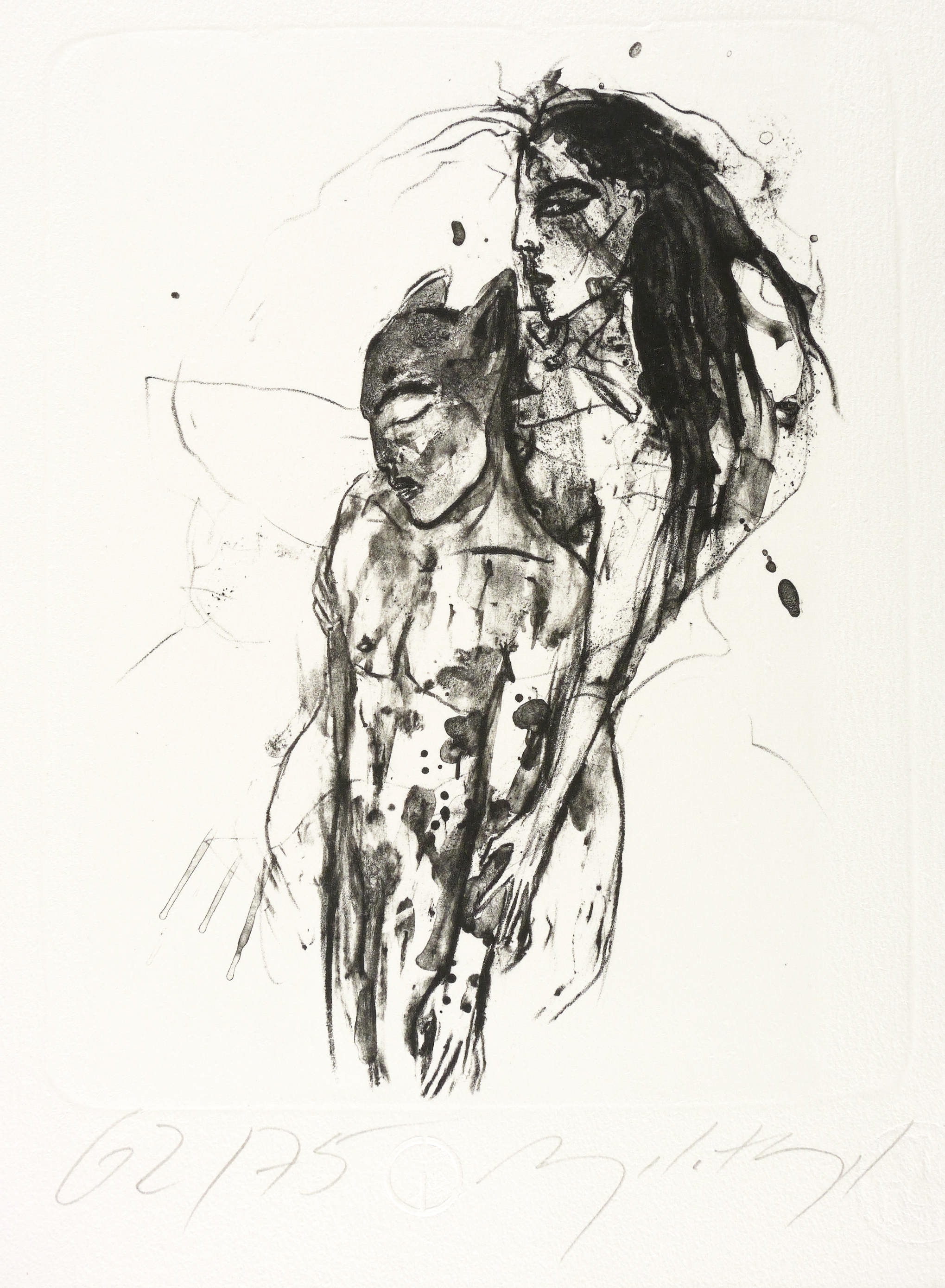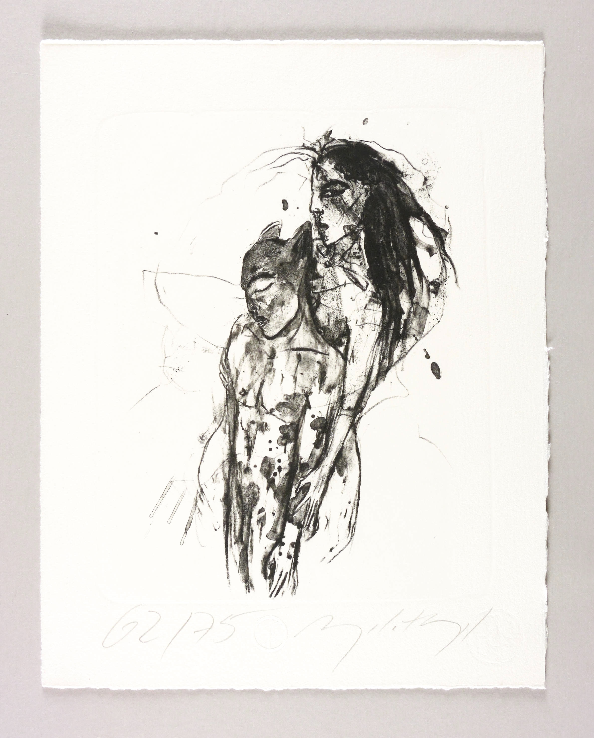 Um 2010. Algrafie / Kreide- & Pinselalgrafie, in Schwarz, auf Hahnemühle-Bütten. – Originale Künstlergrafik, von Angela Hampel. – Auflage Exemplar Nr. 62/75. – 26,6 x 21,4 cm (Darstellung / Platte), 35 x 27,5 cm (Blatt).