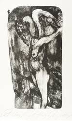 Angela Hampel (*1956 Räckelwitz, lebt und arbeitet in Dresden). Deutsche Malerin und Grafikerin. Lehre und Arbeit als Forstfacharbeiterin. 1977-82 Studium an der HfBK Dresden bei Jutta Damme und D. Büttner. Danach freischaffend. Mitbegründerin der Dresdner Sezession '89. Zahlreiche Einzelausstellungen u.a. in der Galerie Döbele. In ihren Figuren einen sich das Weibliche und das Männliche, das Menschliche und das Tierische, kämpfen gegen einander oder um einander - vital, agressiv und zärtlich zugleich.
