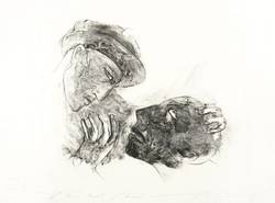 Angela Hampel (*1956 Räckelwitz, lebt und arbeitet in Dresden). Deutsche Malerin und Grafikerin. Lehre und Arbeit als Forstfacharbeiterin. 1977-82 Studium an der HfBK Dresden bei Jutta Damme und D. Büttner. Danach freischaffend. Mitbegründerin der Dresdner Sezession '89. Zahlreiche Einzelausstellungen u.a. in der Galerie Döbele. In ihren Figuren einen sich das Weibliche und das Männliche, das Menschliche und das Tierische, kämpfen gegen einander oder um einander - vital, agressiv und zärtlich zugleich.
