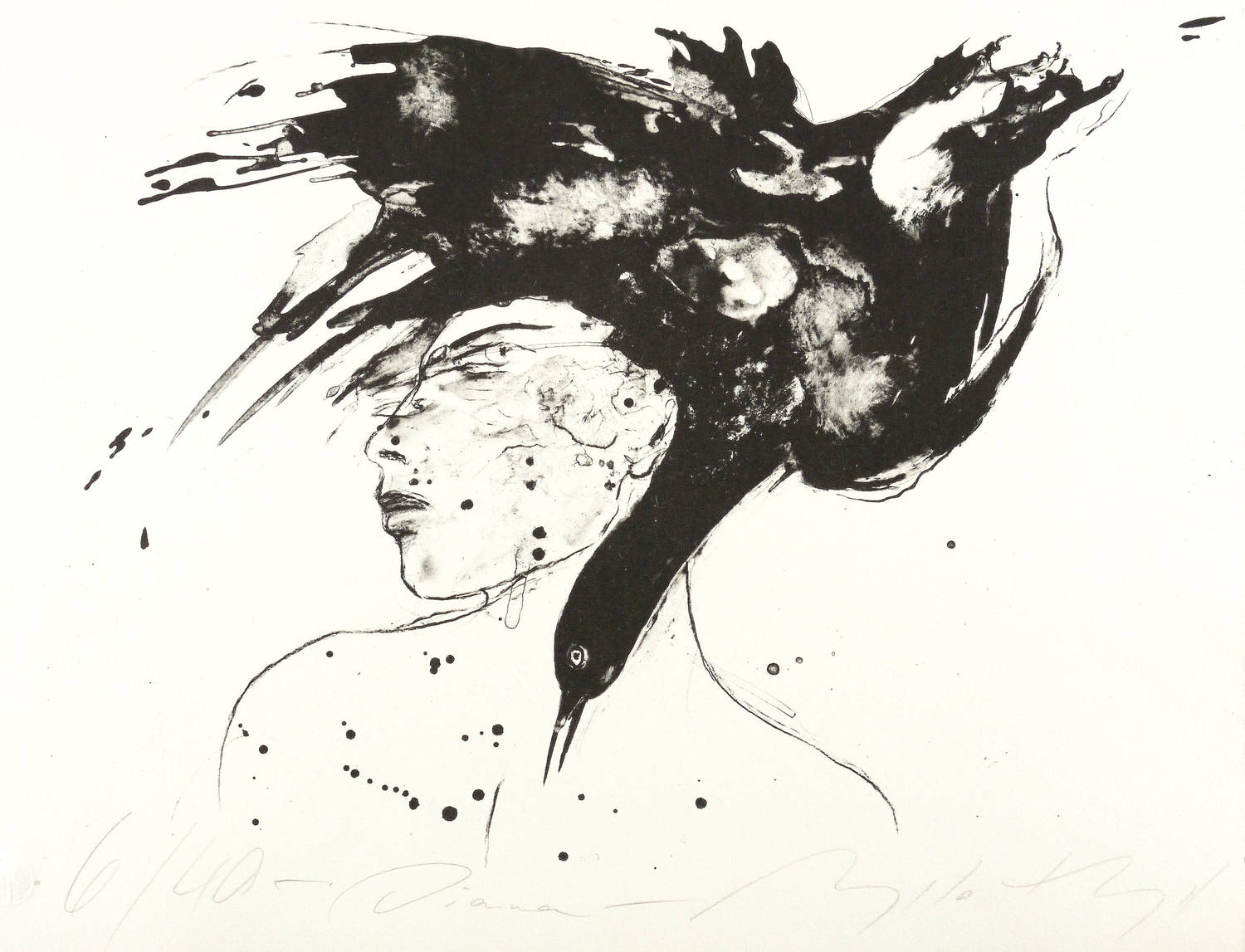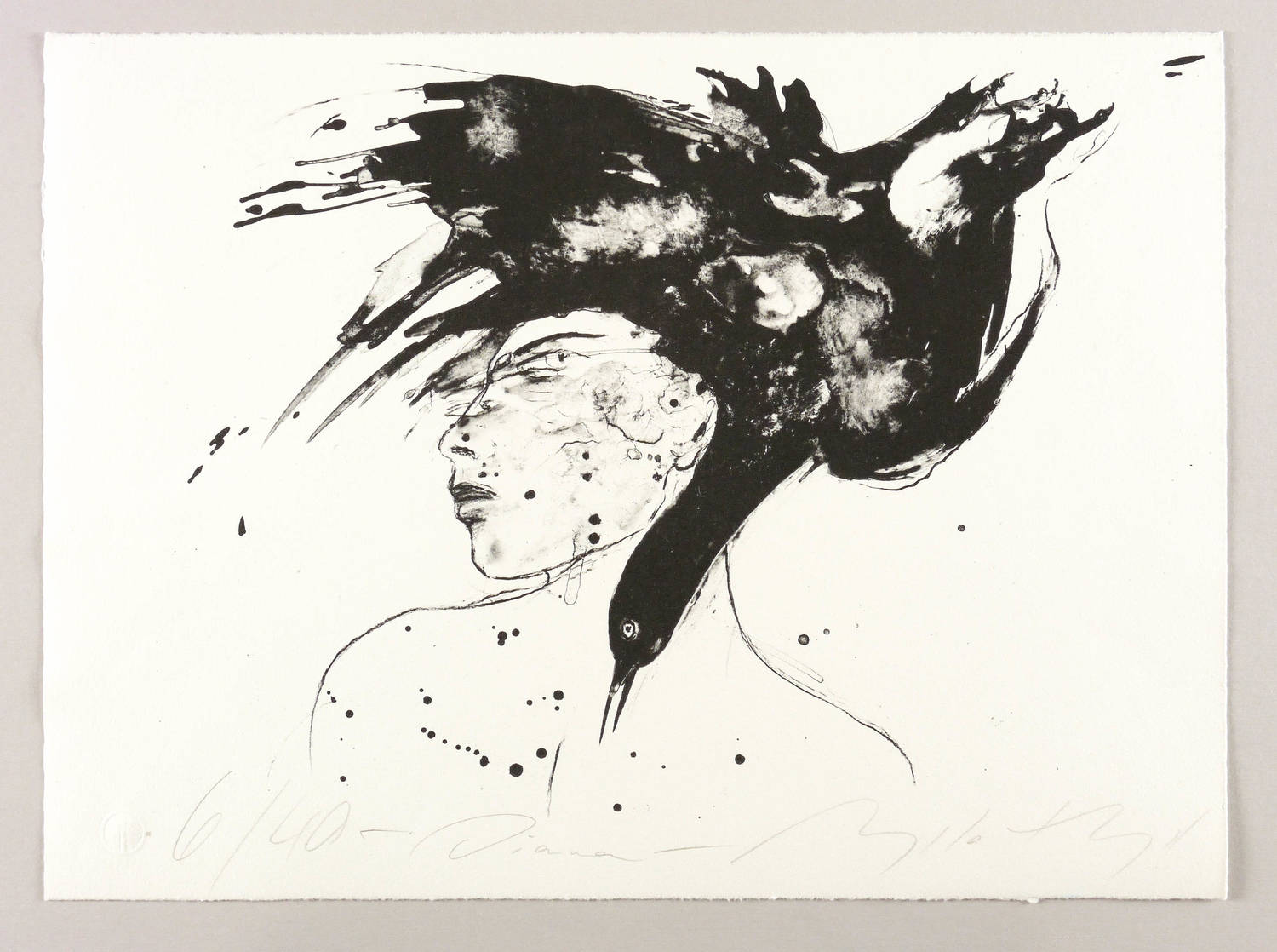 Um 1995. Algrafie / Kreide- & Pinselalgrafie, in Schwarz, auf Bütten. – Originale Künstlergrafik, von Angela Hampel. – Auflage Exemplar Nr. 6/40. – 34,0 x 44,0 cm (Darstellung), 38 x 52 cm (Blatt).